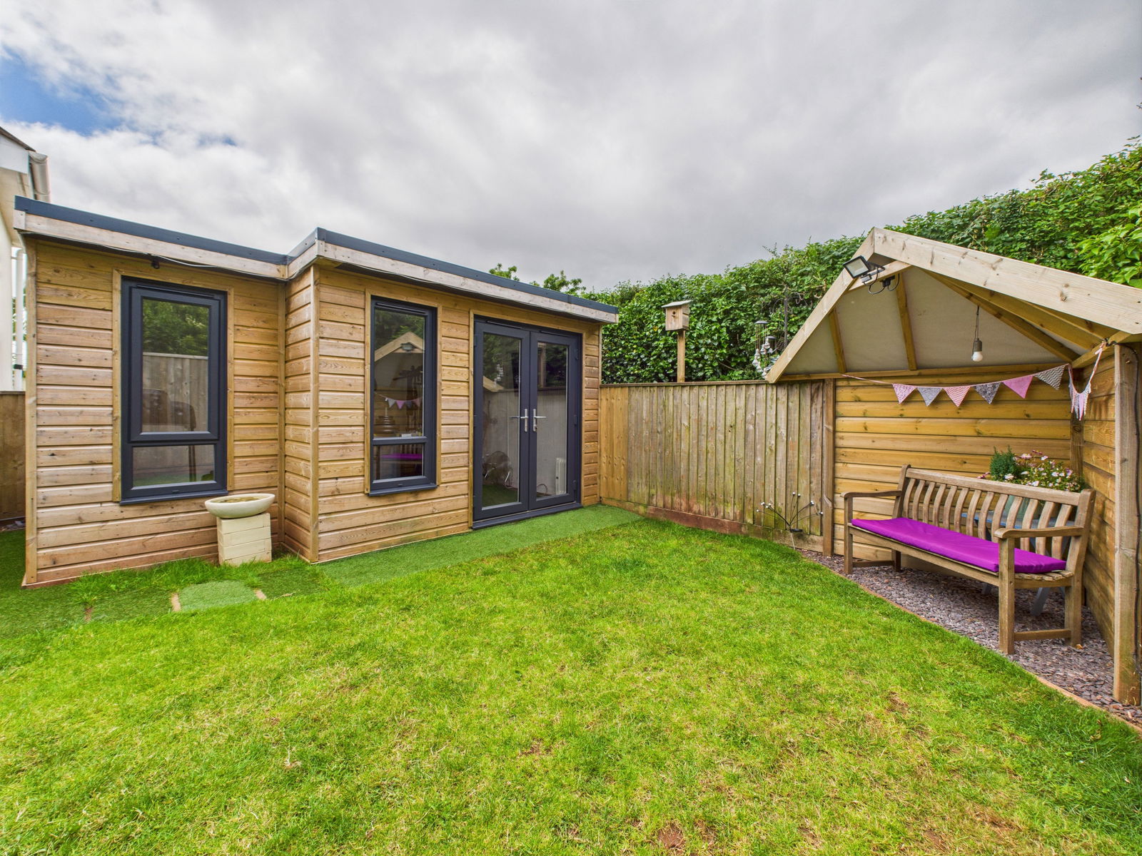 REAR GARDEN A beautifully landscaped south west facing rear garden designed for both relaxation and entertaining. A raised sun deck provides the perfect setting for al fresco dining, with steps leading to a well maintained lawn. The fully insulated garden cabin equipped with lighting and electrical points offers endless possibilities whether as a home office, games room, or tranquil retreat.