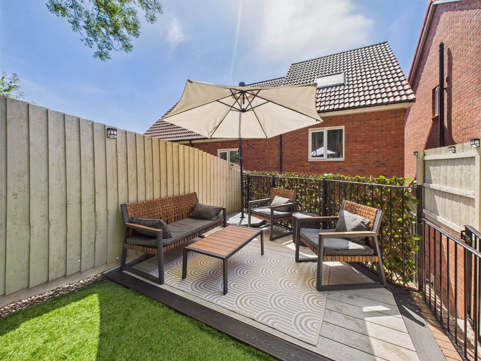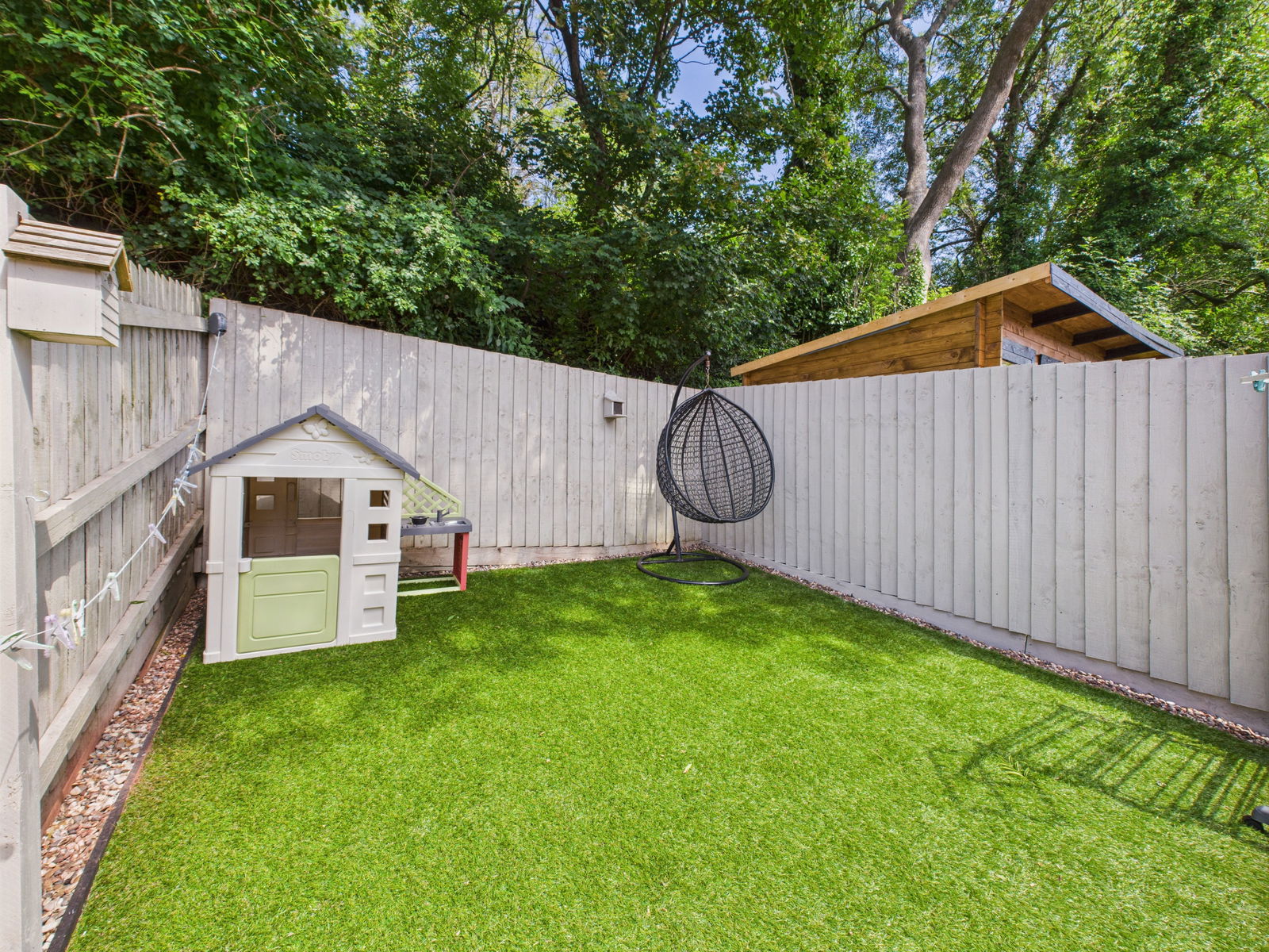 REAR Garden, An enclosed rear garden divided into two sections. The first being a patio area, the second being laid with artificial grass with a well presented composite decking seating area.