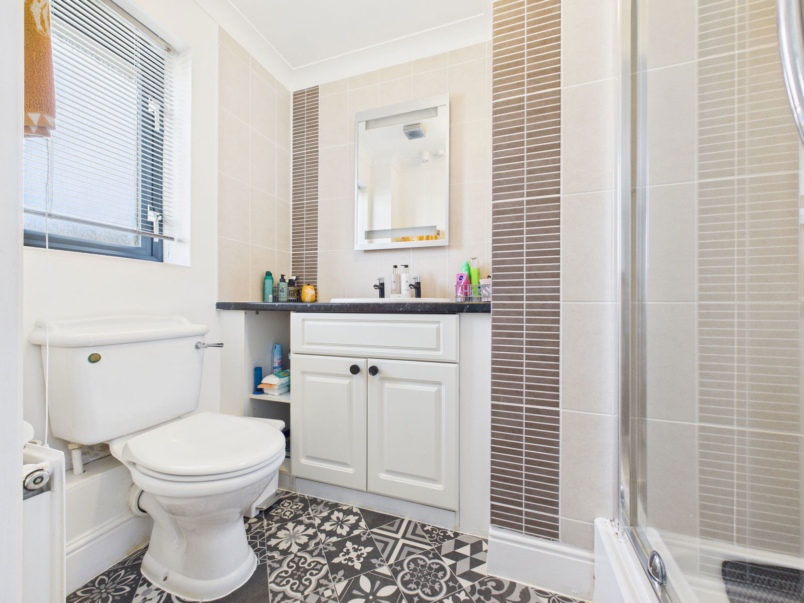EN-SUITE A well appointed en-suite with a shower cubicle, vanity wash hand basin with storage below and low level flush WC. Finished with tiled walls, extractor fan, uPVC obscure glazed window and gas central heating radiator.