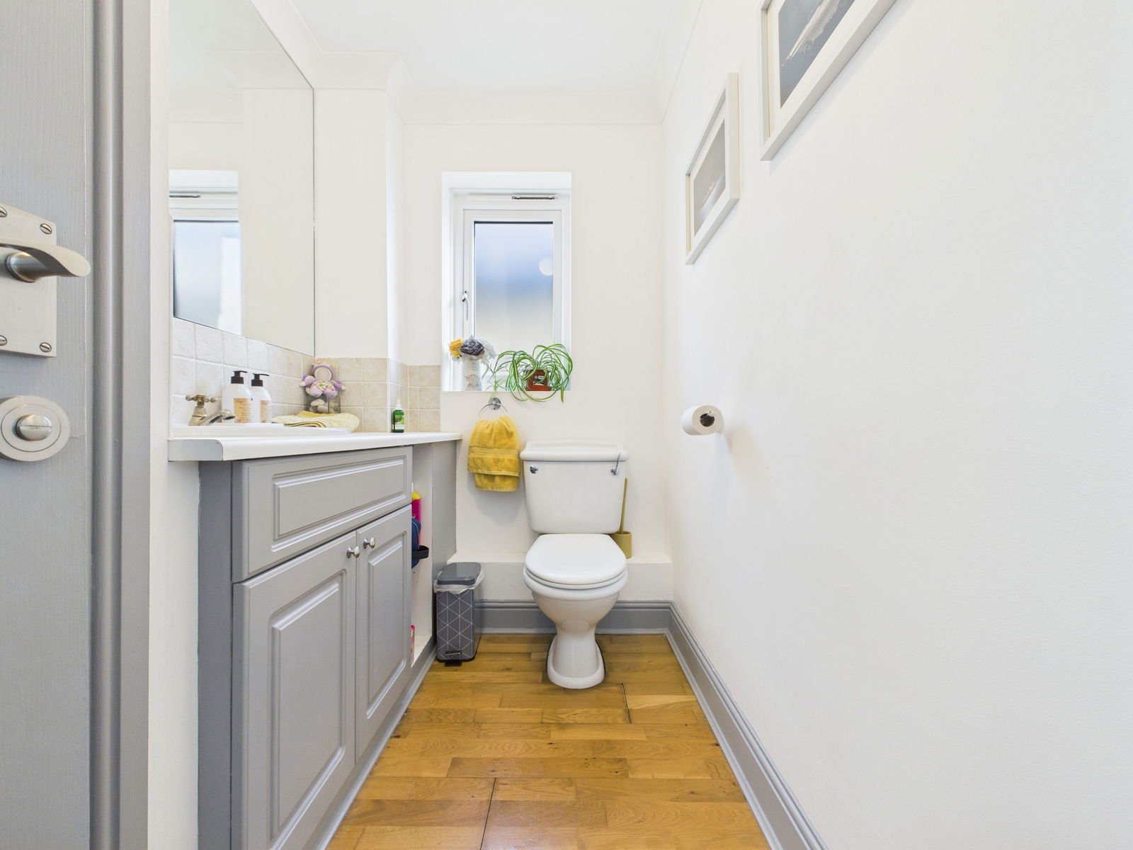 CLOAKROOM A convenient ground floor WC with a low level flush toilet and vanity wash hand basin with storage below. Also features a built in storage cupboard, uPVC obscure glazed window and gas central heating radiator.