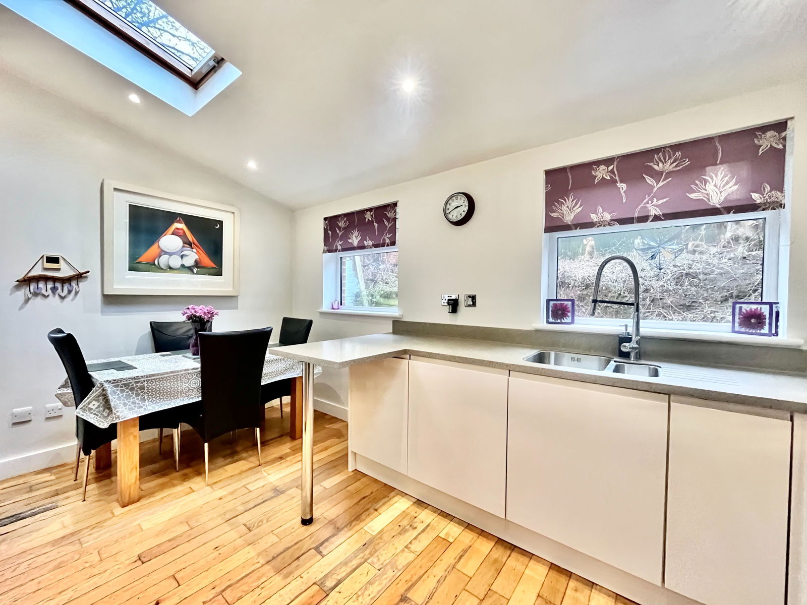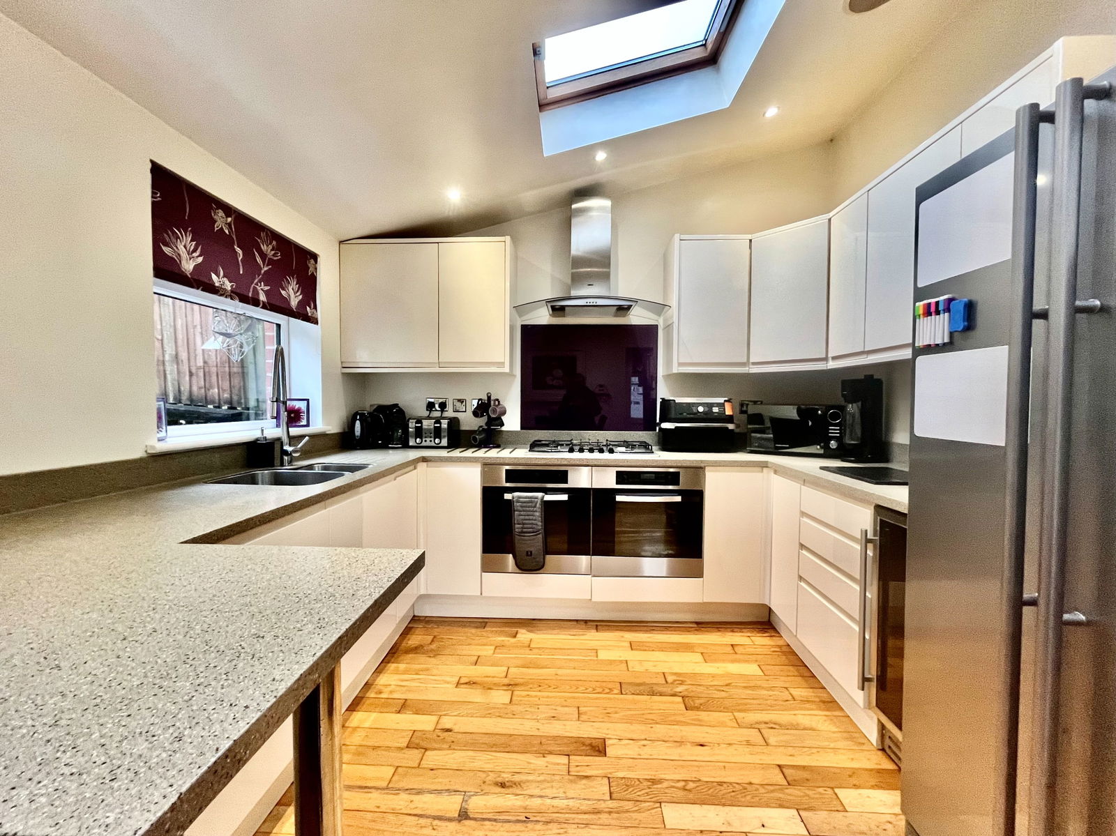 KITCHEN - 4.3m x 3.14m (14'1" x 10'3") A beautifully light filled and spacious kitchen/diner perfect for entertaining with a range of overhead, base and drawer units with square edged work surfaces above. A 1 1/2 bowl stainless steel sink and drainer unit, two electric ovens with grill integrated and a five ring gas hob with extractor hood above. An integrated dishwasher and wine fridge, space and plumbing for an American fridge freezer. Vaulted ceilings, Velux windows and space for a 6 seater dining table. uPVC double glazed windows and uPVC double glazed door leading out to the gardens.
