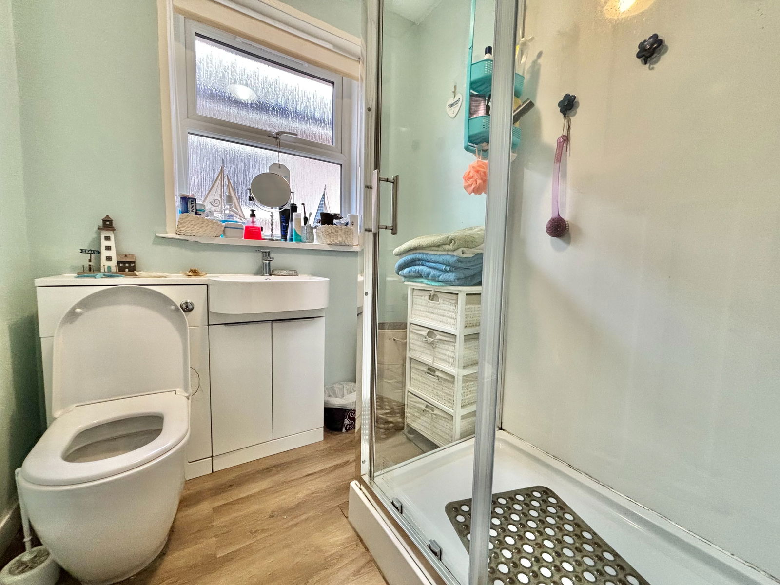 SHOWER ROOM A contemporary shower room that boasts a three piece suite comprising of a low level flush WC, a vanity wash hand basin with fitted storage below and work surfaces to the side as well as a large walk in double shower unit. uPVC obscure double glazed window and a chrome heated towel rail.