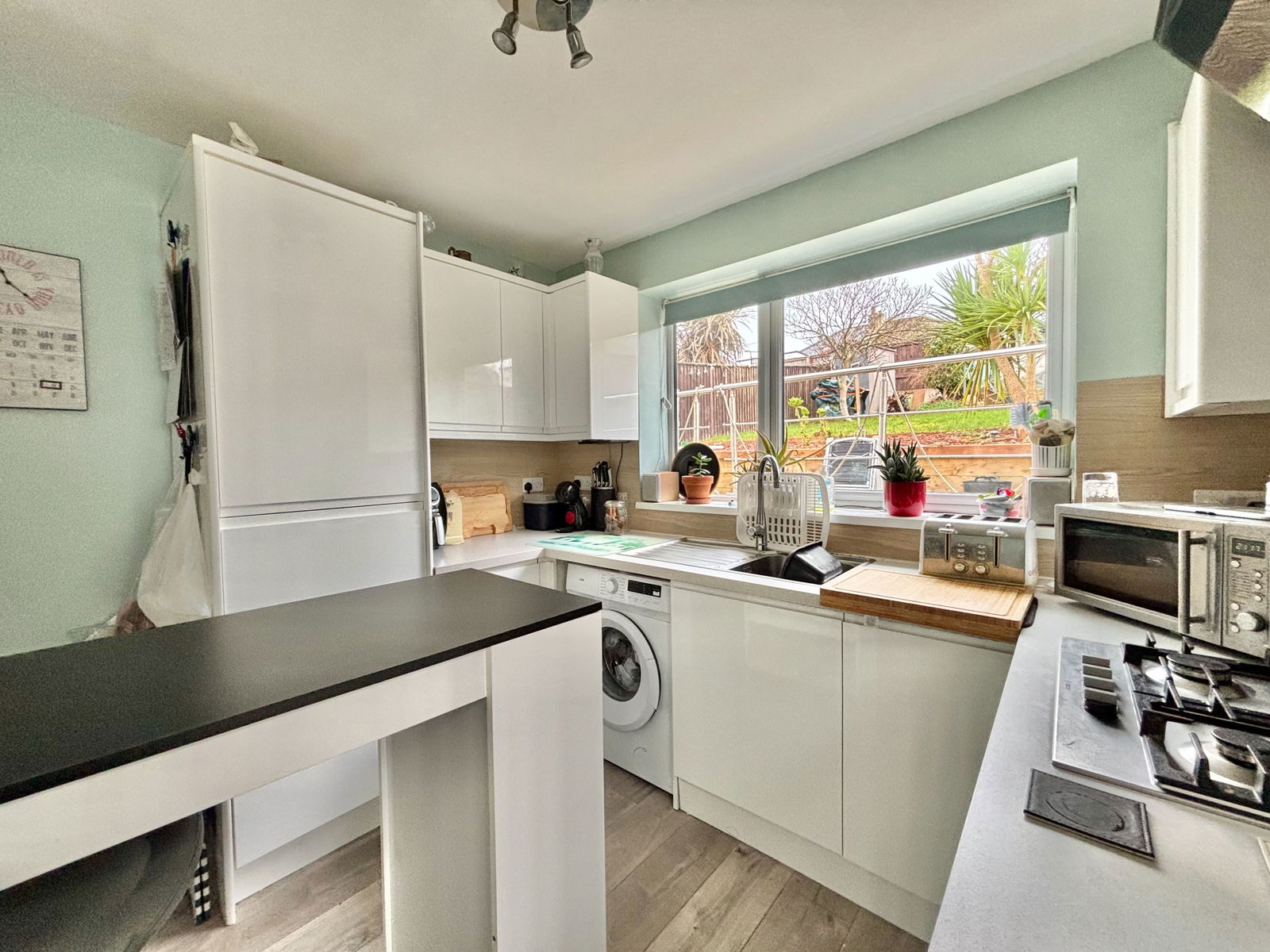 KITCHEN - 2.9m x 2.77m (9'6" x 9'1") A newly fitted kitchen boasting a range of overhead, base and drawer units with square edged work surfaces above. A 1 bowl stainless steel sink and drainer unit, an electric single oven with grill integrated and a four ring gas hob with extractor hood above as well as an integrated fridge freezer. Space and plumbing for a washing machine, panel backsplash, fuse box and a uPVC double glazed window overlooking the rear gardens.