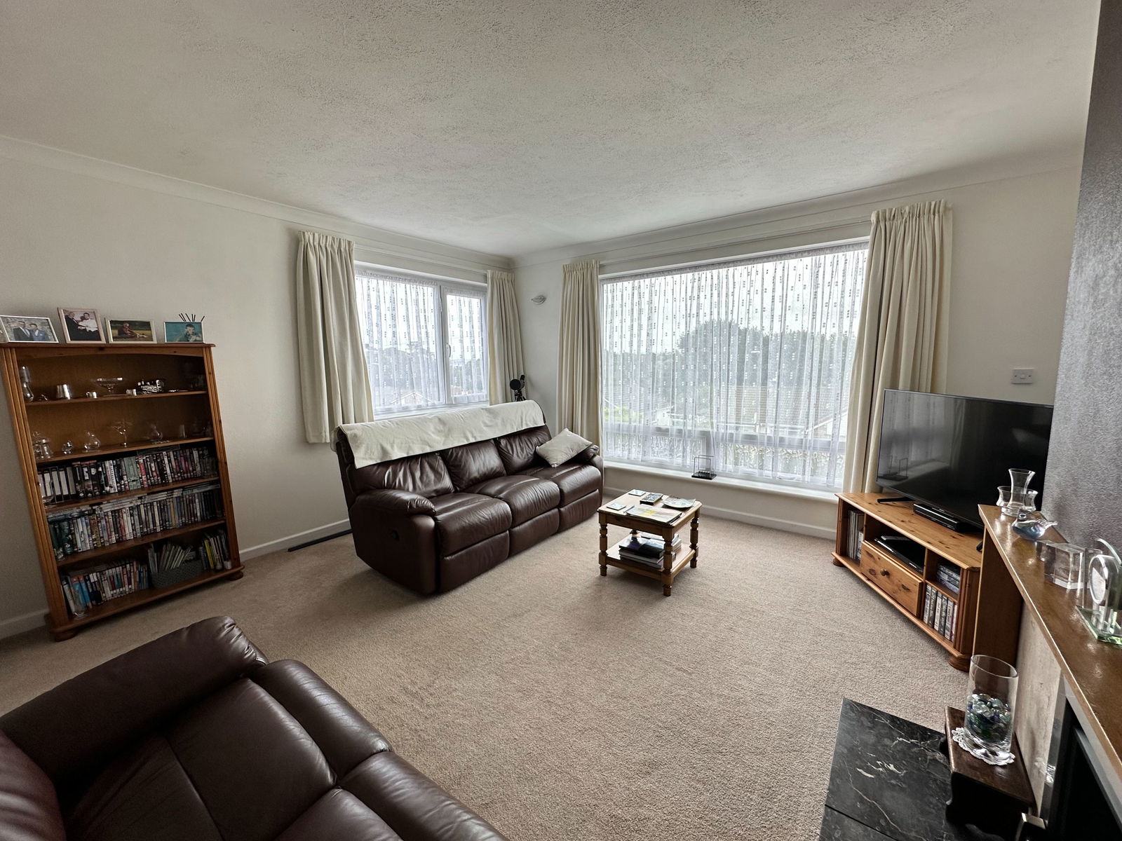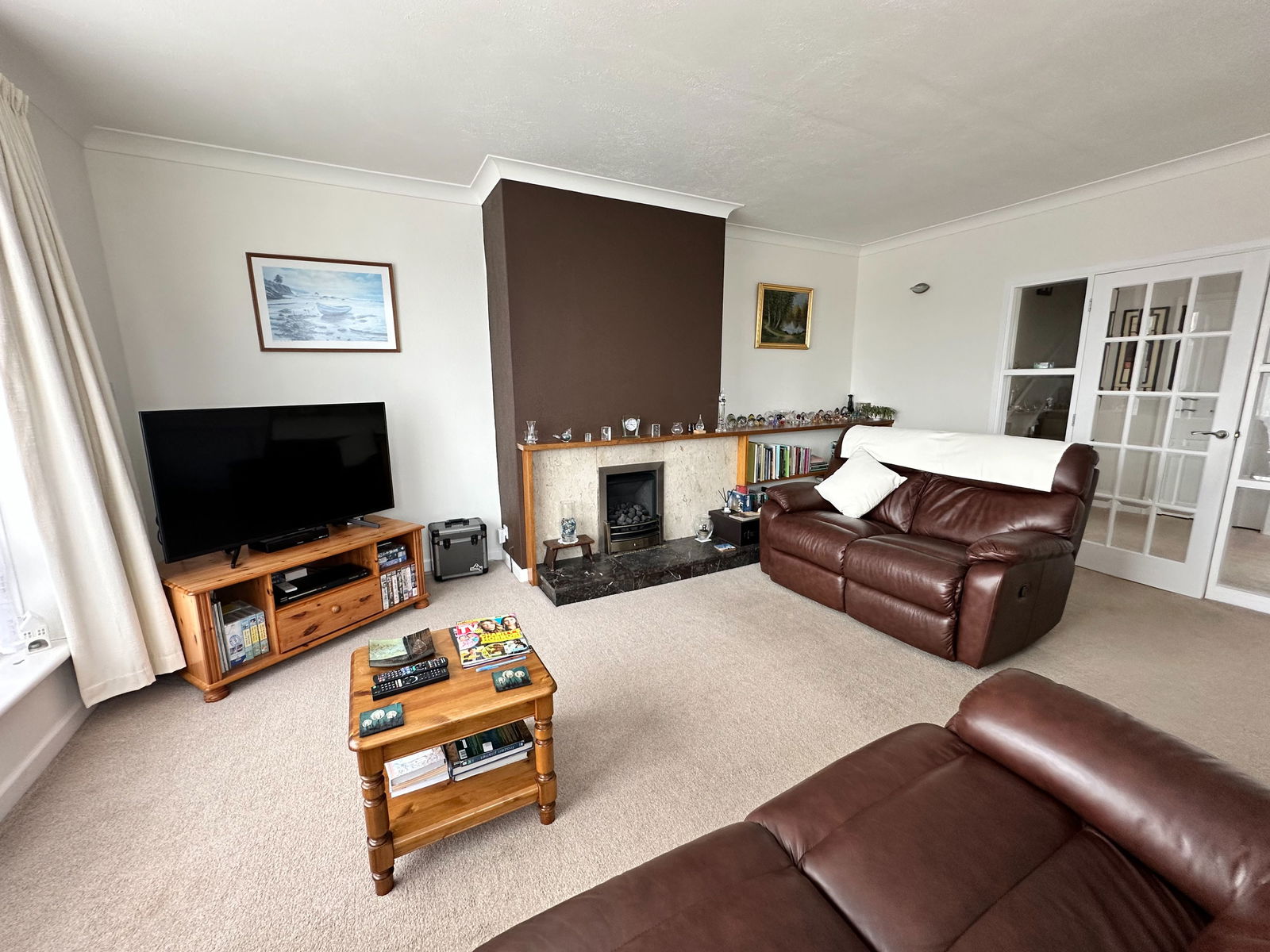 LOUNGE - 5.4m x 4.4m (17'8" x 14'5") MAX. A spacious lounge with large double glazed picture window overlooking Clennon Valley with distant sea views across Goodrington to Broadsands and Brixham. Decorative fireplace with marble surround and hearth with display shelving to one side plus inset living flame gas fire. Two radiators. Second double glazed window. Cable TV access. Wall lights.