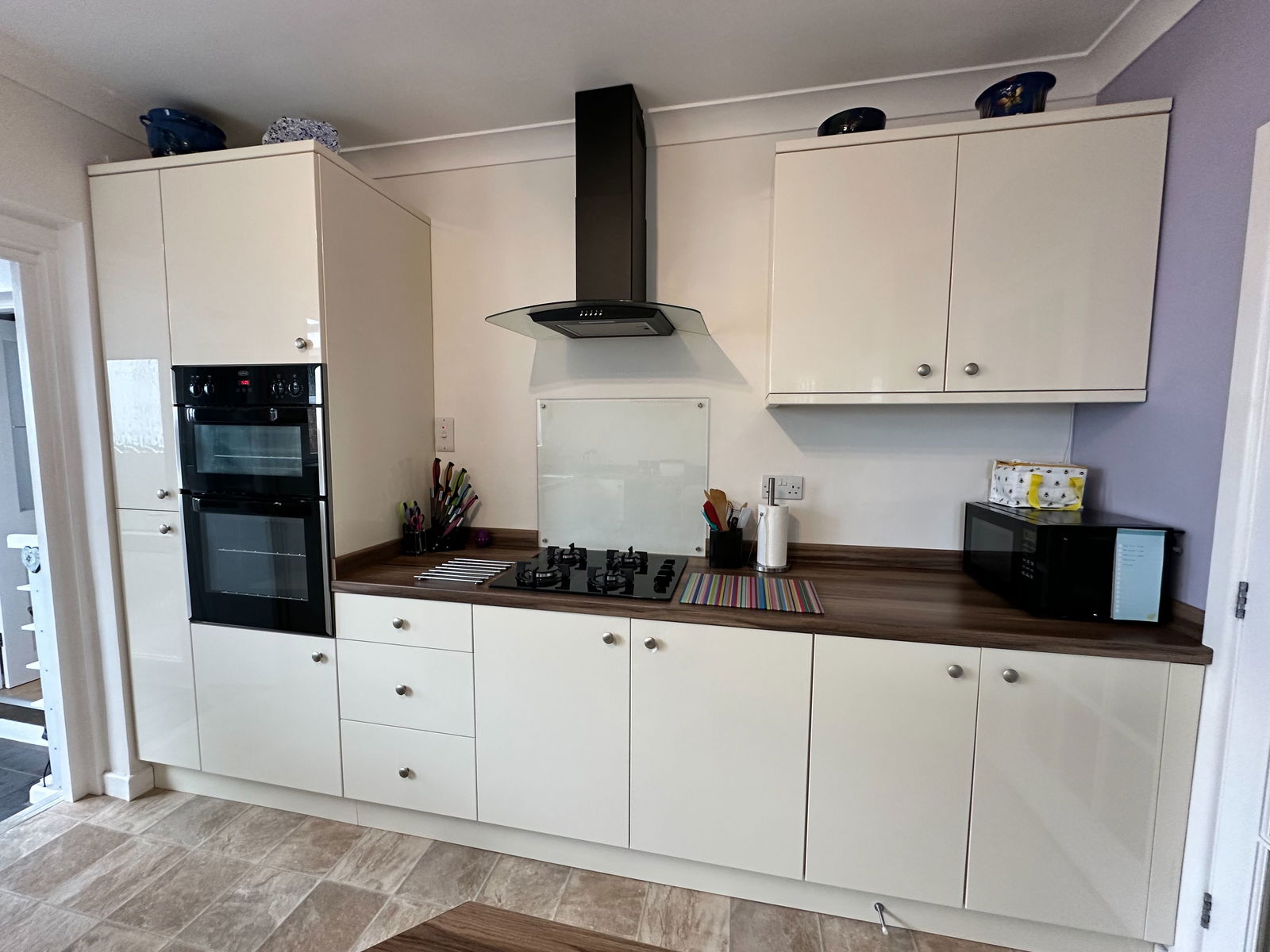 KITCHEN/BREAKFAST ROOM - 3.9m x 3.3m (12'9" x 10'9") MAX. A well-appointed kitchen with a range of matching cream gloss wall and base units topped with wood block effect work surfaces. Single drainer stainless steel sink unit with mixer tap. Plumbing for dishwasher. Integrated double oven and grill and inset gas hob with cooker hood over. Peninsular breakfast bar. Appliance space. Double glazed window. Radiator. Bi-fold door to:-