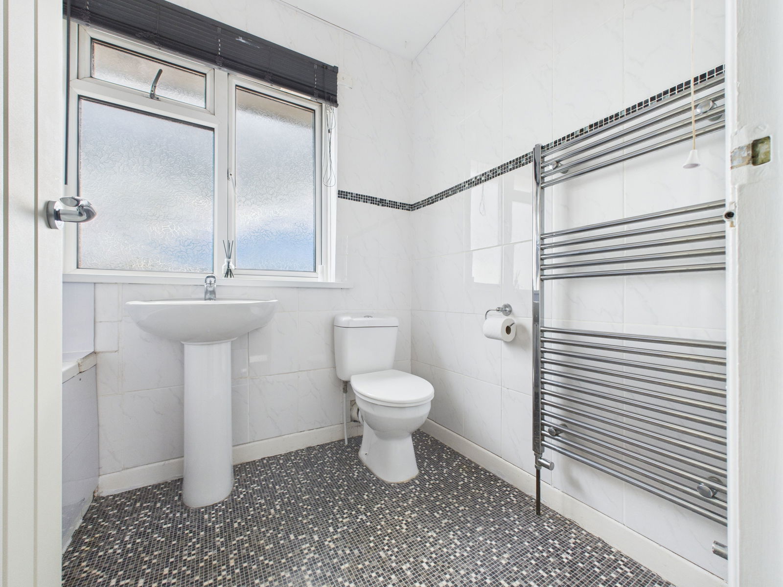 BATHROOM A three piece suite comprising of a low level flush WC, a pedestal wash hand basin and a panelled bath unit with shower attachments above and a protective glass shower screen. Part tiled and panelled walls. Extractor fan, uPVC obscure double glazed window and a chrome heated towel rail.