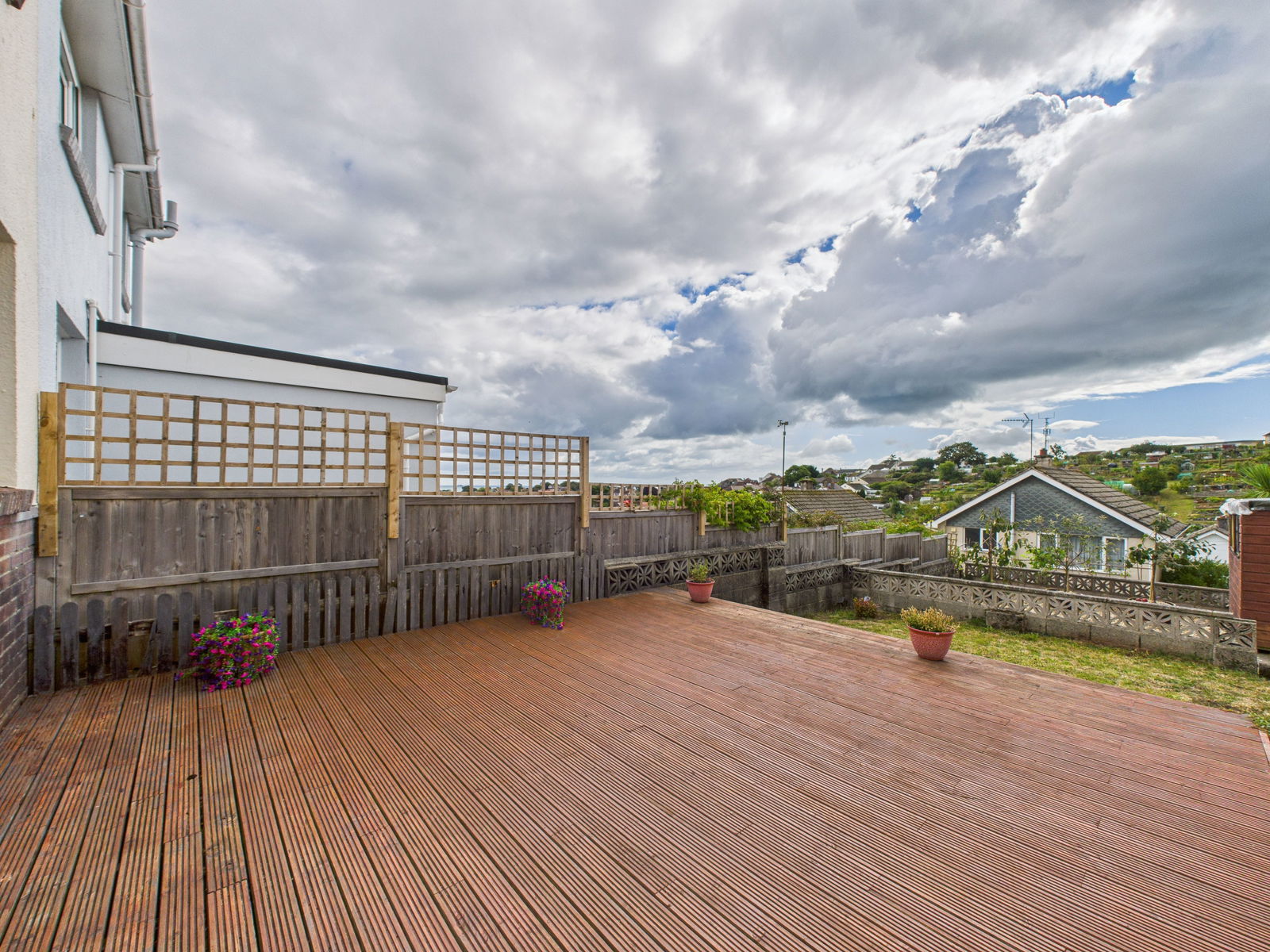 OUTSIDE A south east facing that has been thoughtfully designed for ease of maintenance. The gardens boast a large decking area where you can enjoy an open outlook with a great sea view, a lawned section and a further pebble stoned area also.