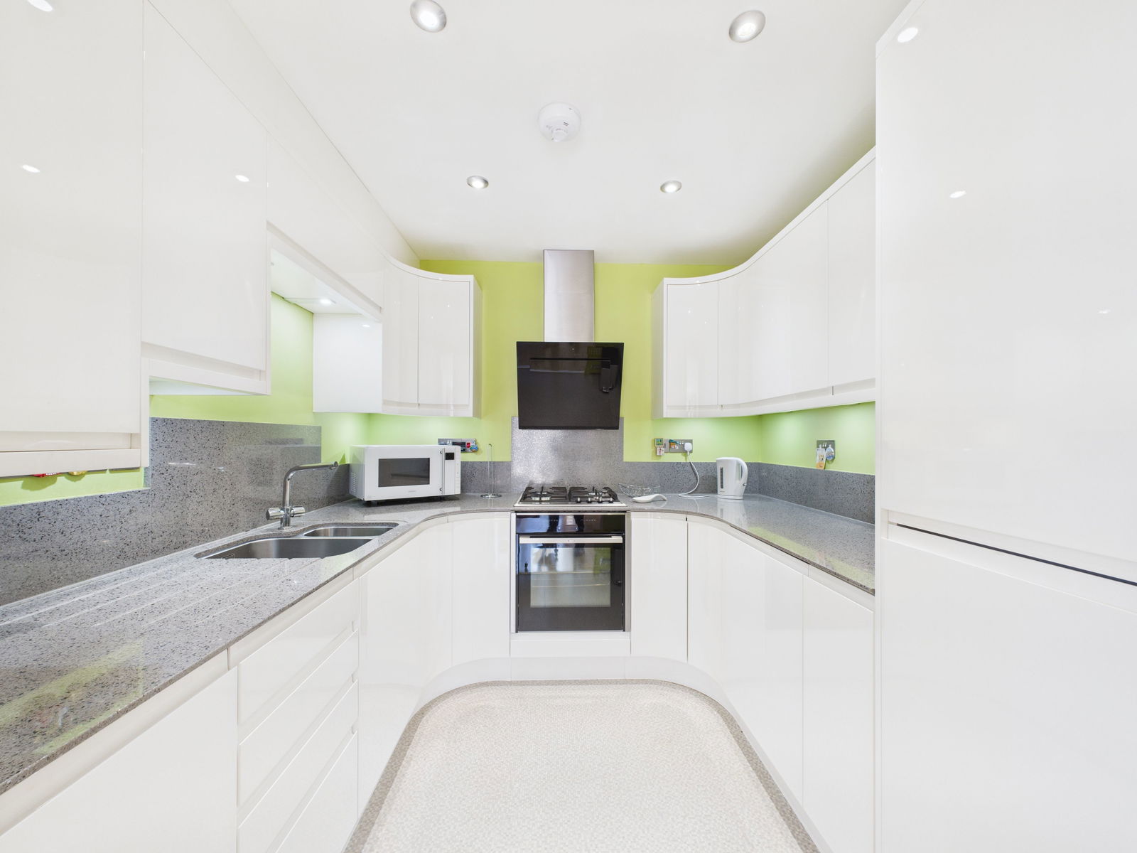 KITCHEN Range of high gloss white fronted units with quartz work tops and splash back. Base and wall units with integrated appliances and gas hob with electric oven and extractor fan above. Concealed gas boiler for central heating.
