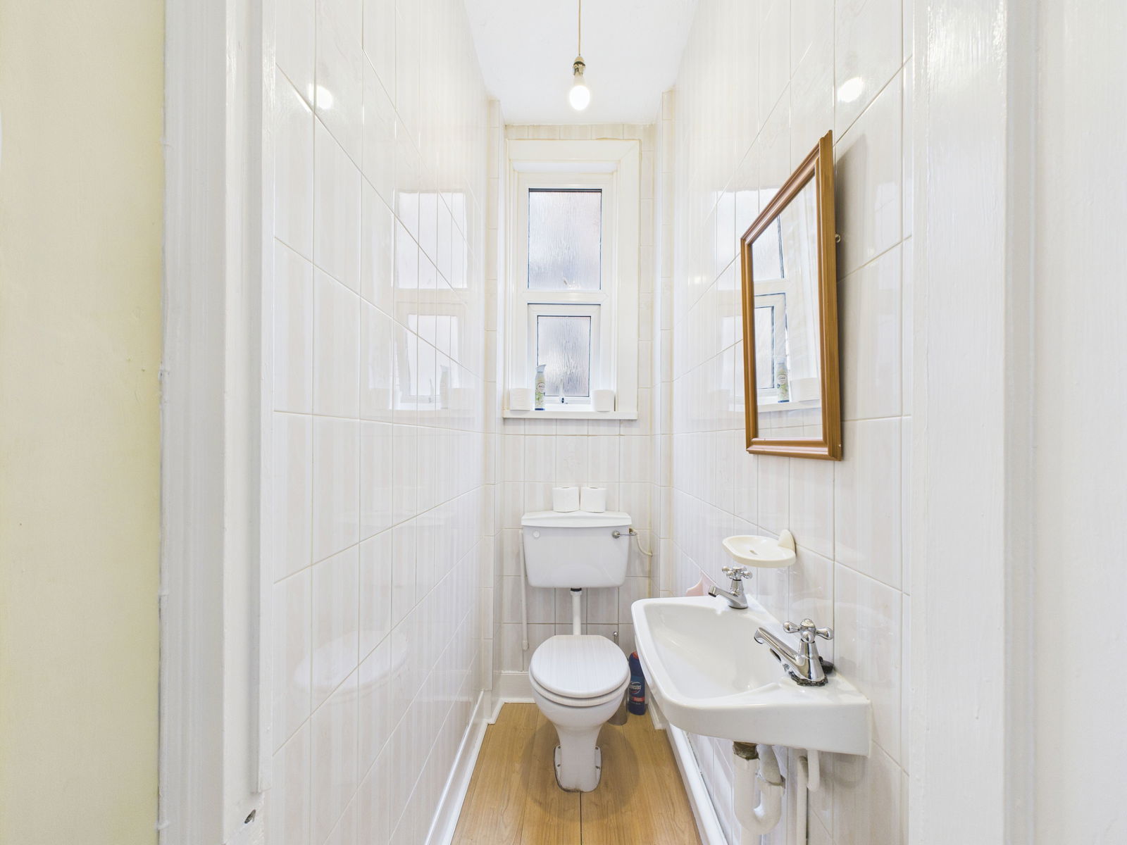 CLOAKROOM A convenient downstairs cloakroom comprising a low level flush WC, wall mounted wash hand basin, tiled walls and a uPVC obscure double glazed window.