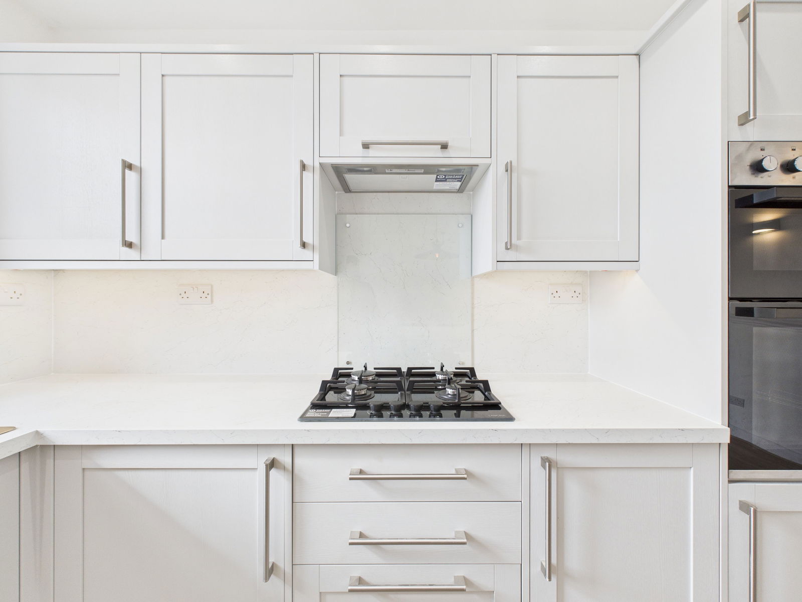 KITCHEN AREA Range of recently fitted luxury high end new light grey units comprising 1.5 bowl sink with cupboards and drawers under. Fitted wall and base units with breakfast bar island. Built in concealed appliances including dishwasher, fridge and freezer. Gas hob with double eye level oven. Extractor. Spot lighting and uPVC double gazing. Opening onto:-