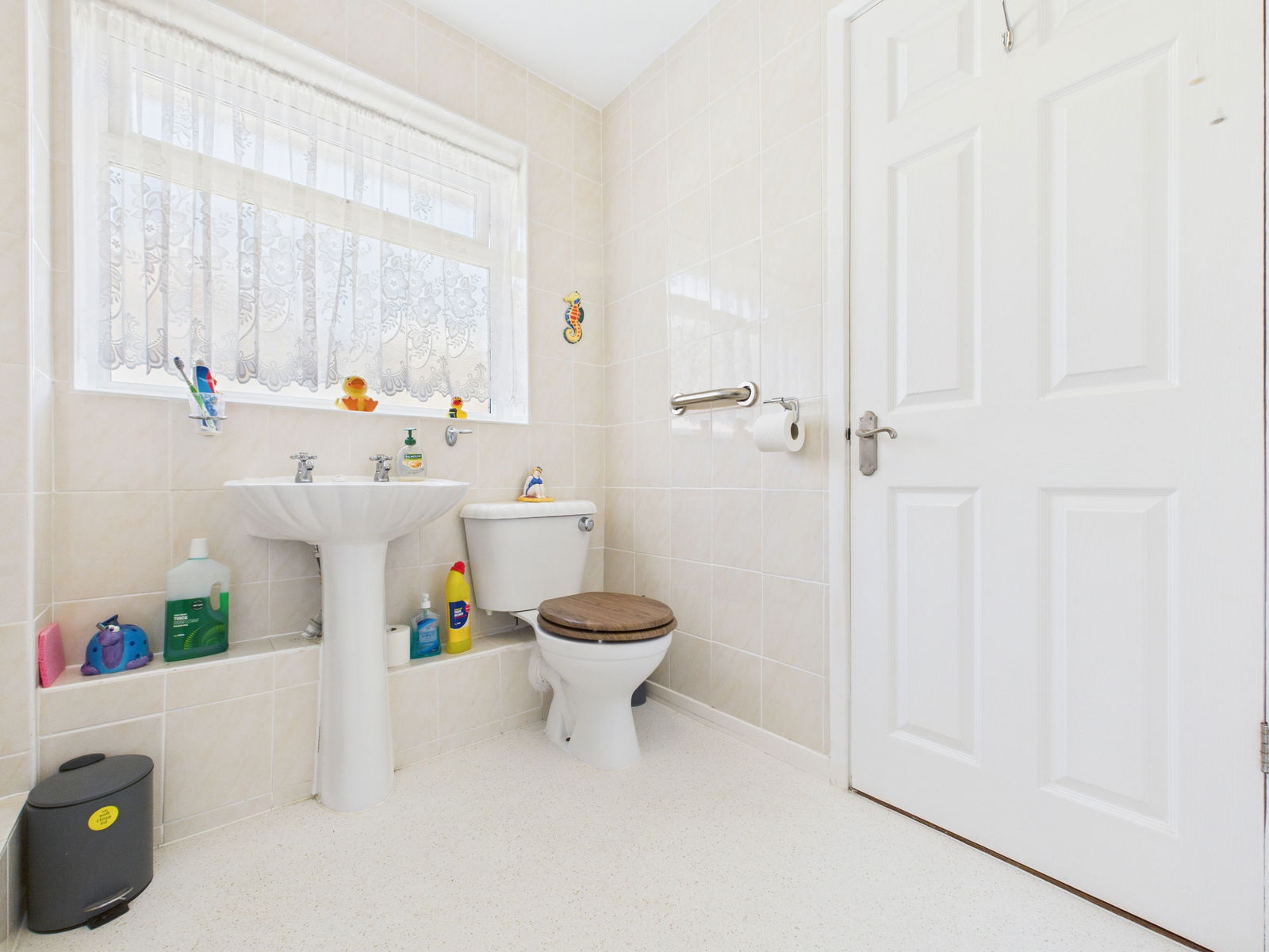 BATHROOM A practical and accessible wet room comprising a low level flush WC, pedestal wash basin and wall mounted shower with wet room style flooring. Finished with tiled walls, an obscure uPVC double glazed window and a deep built in storage cupboard.