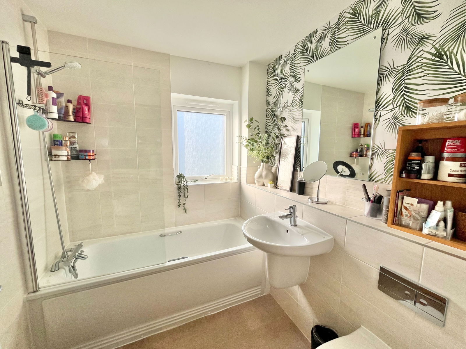 BATHROOM A modern family bathroom with a three piece suite comprising of a low level WC, a wall mounted wash hand basin and a panelled bathtub with fitted shower over and glass shower screen. Complimentary tiled walls, shaver points, a white heated towel rail, extractor fan and a uPVC double glazed frosted window.
