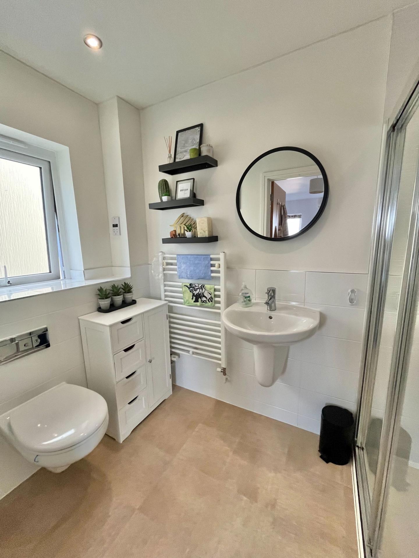 ENSUITE A modern three piece suite comprising of a low level w.c, a wall mounted wash hand basin and a walk in double shower. Complimentary tiled walls. A white heated towel rail, shaver points, extractor fan and a Upvc double glazed frosted window.