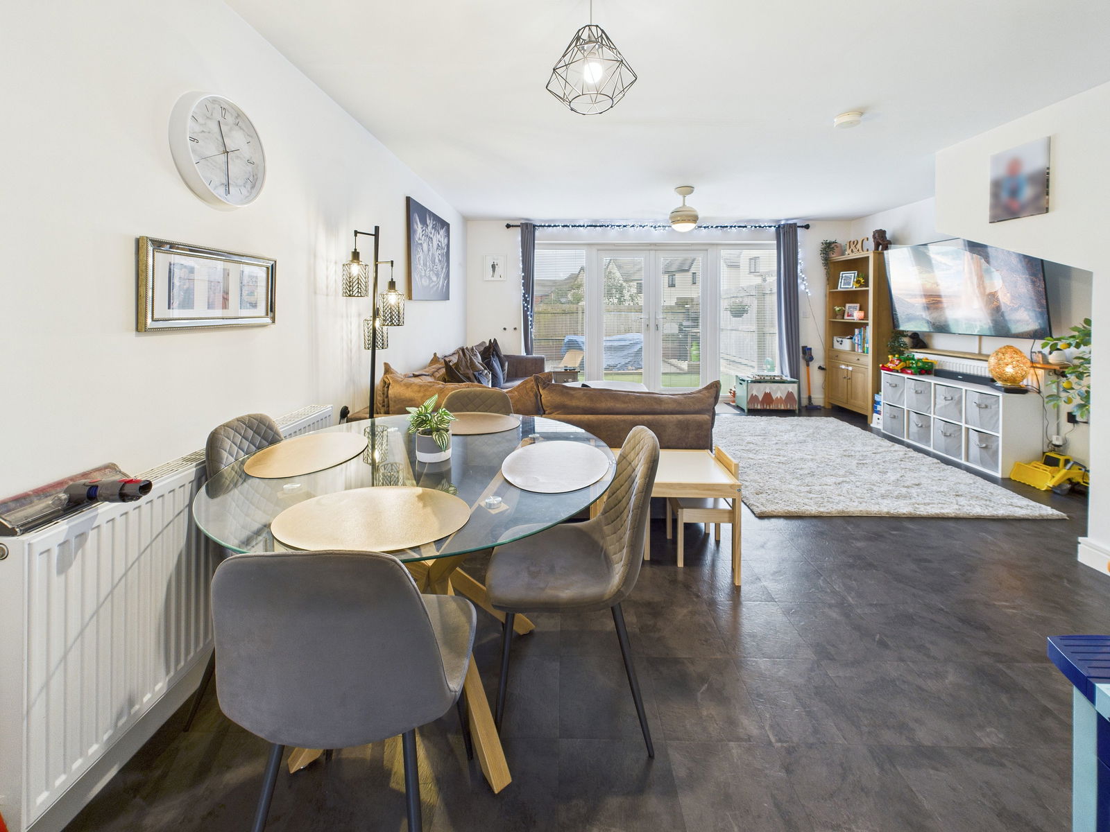 The living and dining areas offer plenty of room for furniture, featuring a TV point, two gas central heating radiators, a useful under stairs storage cupboard, and uPVC French doors that open directly onto the rear garden with full length side windows.