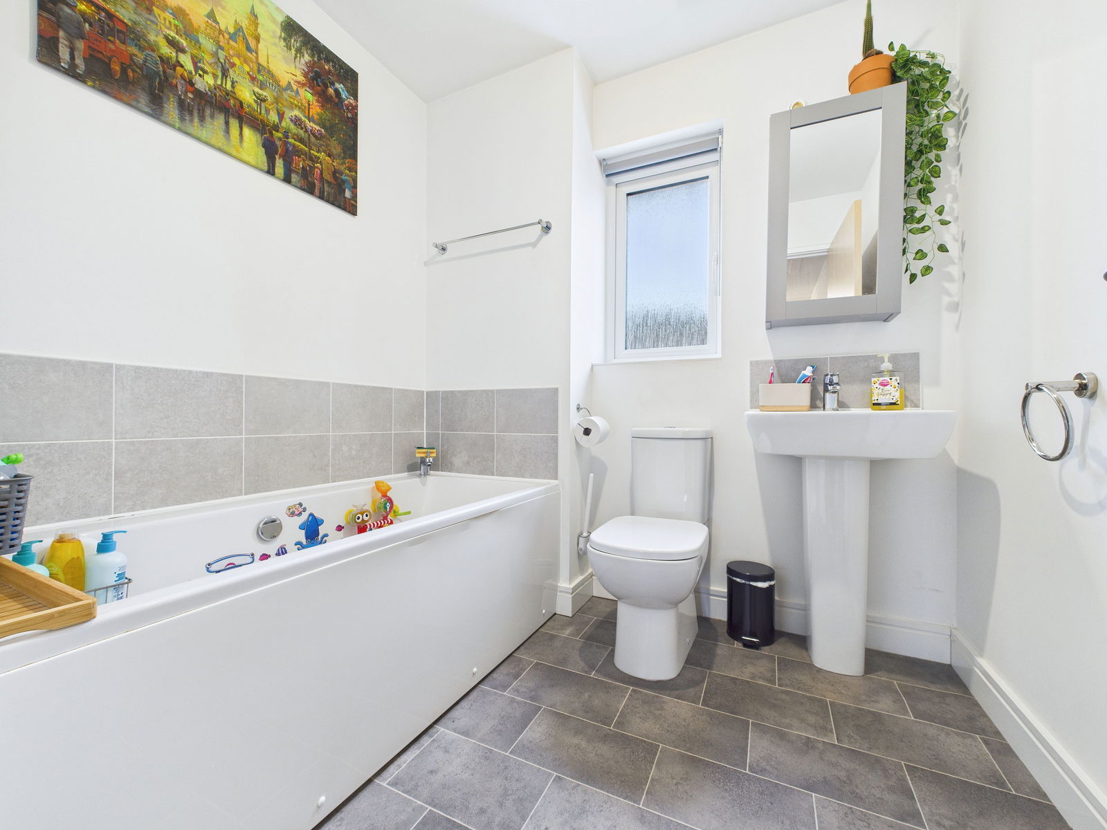 FAMILY BATHROOM A stylish family bathroom fitted with a WC, pedestal wash basin and panelled bath. Finished with an extractor fan, obscure uPVC double glazed window and gas central heating radiator.