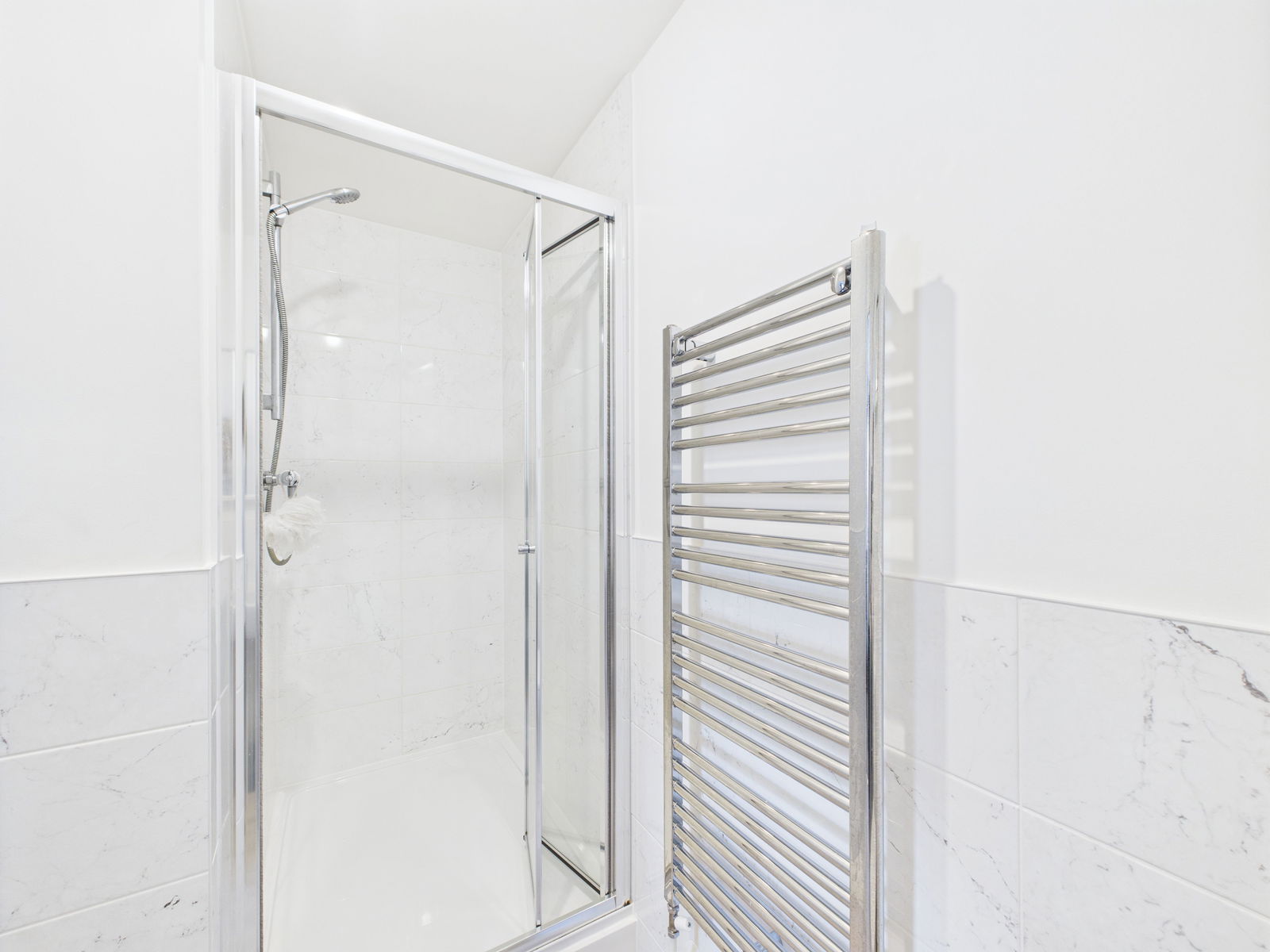 EN-SUITE A modern master en-suite boasting a low level flush WC, a pedestal wash hand basin and a walk in double shower unit. Complimentary marble effect porcelain tiling, extractor fan and a chrome heated towel rail.