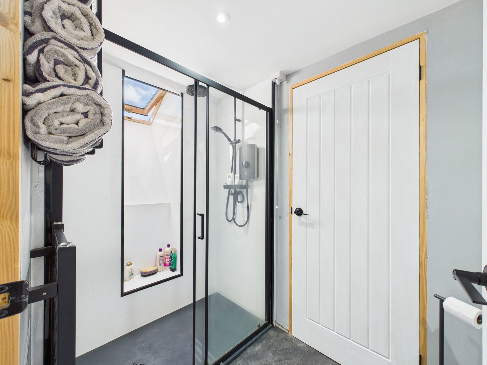 JACK AND JILL EN-SUITE A stylish and contemporary en-suite shared between bedrooms one and three. Featuring a walk in double shower, vanity wash hand basin with storage, low level flush WC, Velux window and a modern black heated towel rail.