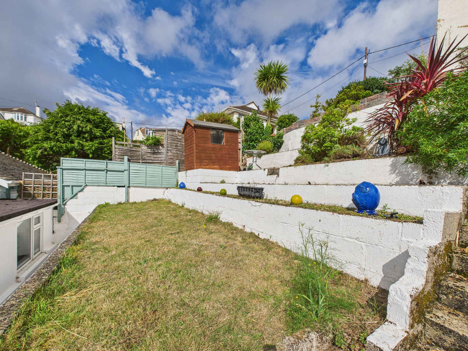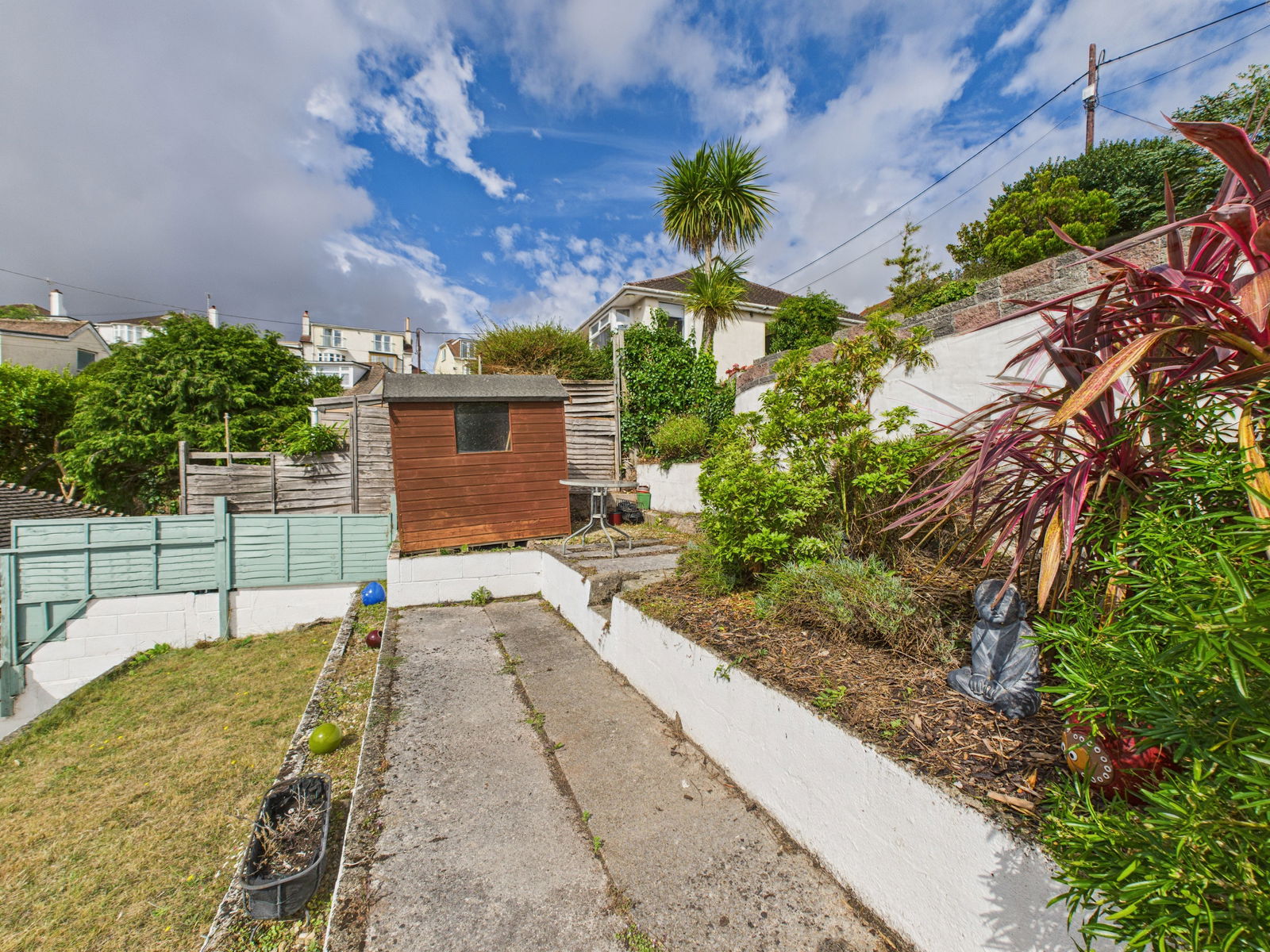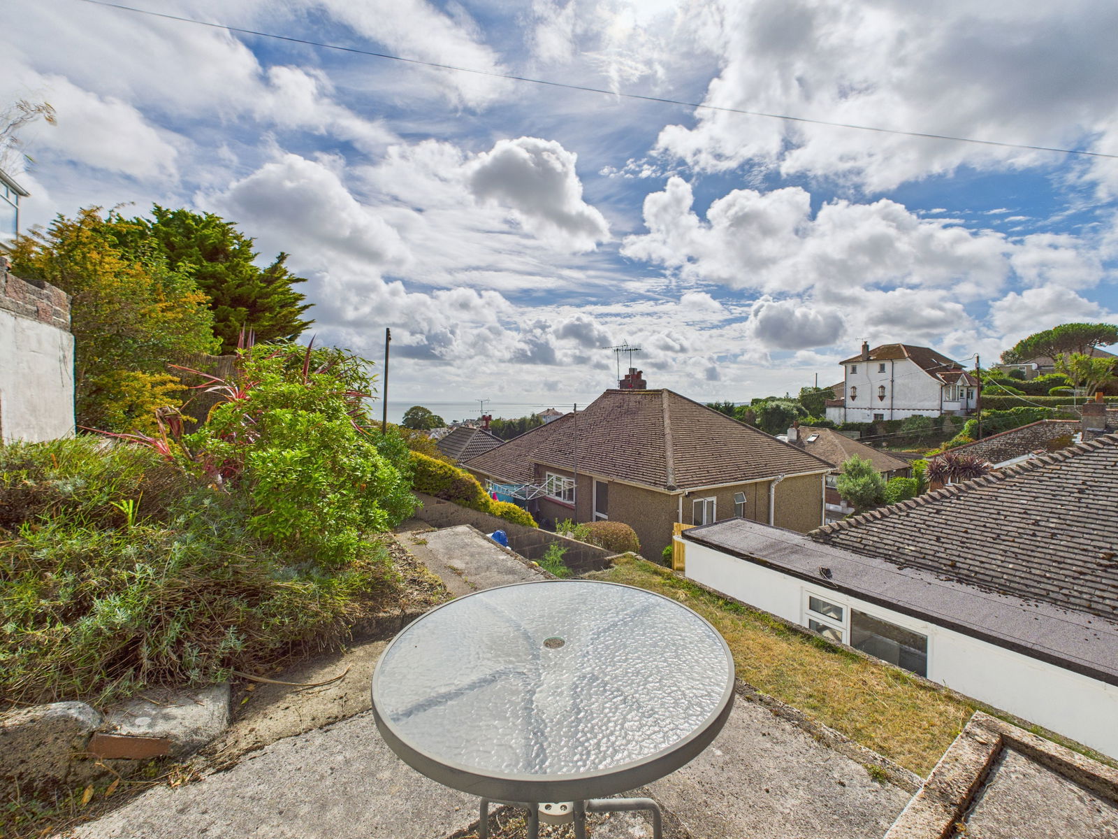 OUTSIDE The south facing rear garden is arranged over three tiers, making the most of its elevated position. The first tier features a neatly kept lawn, while two further levels are laid to patio perfect for alfresco dining and entertaining. All set against the backdrop of stunning sea views.
