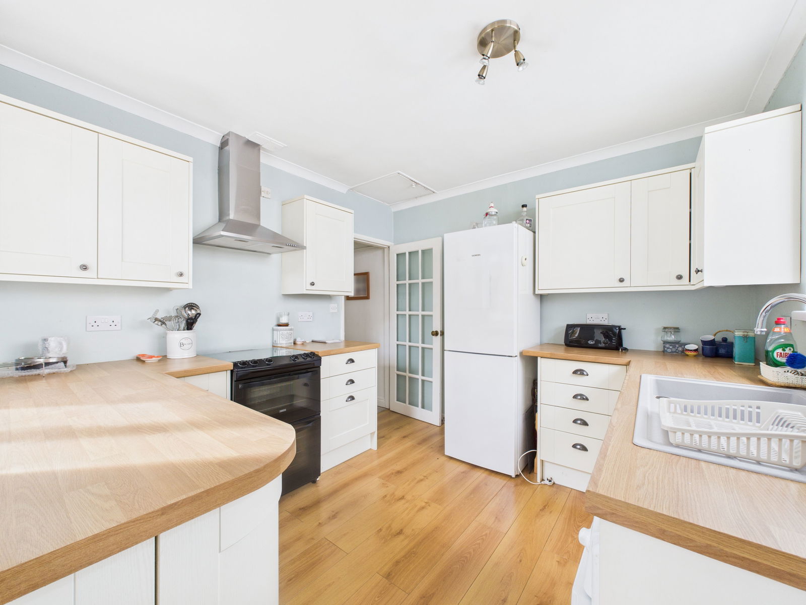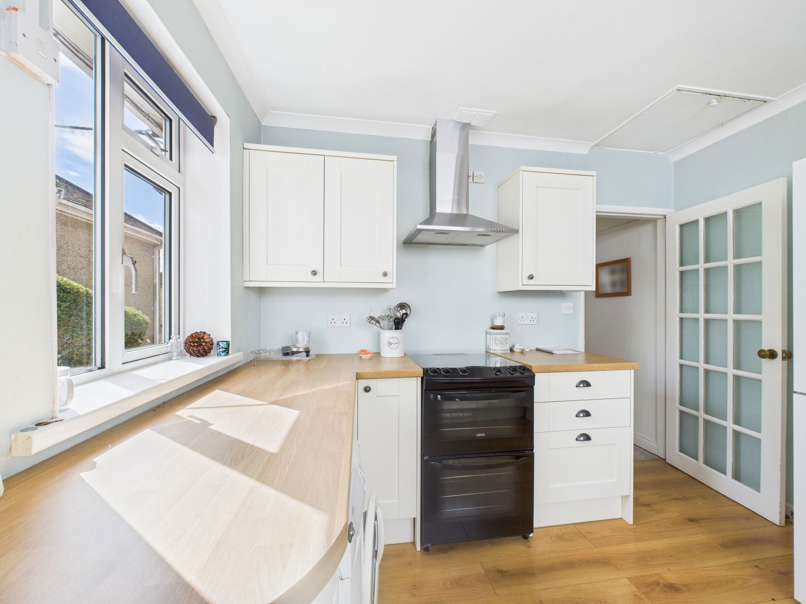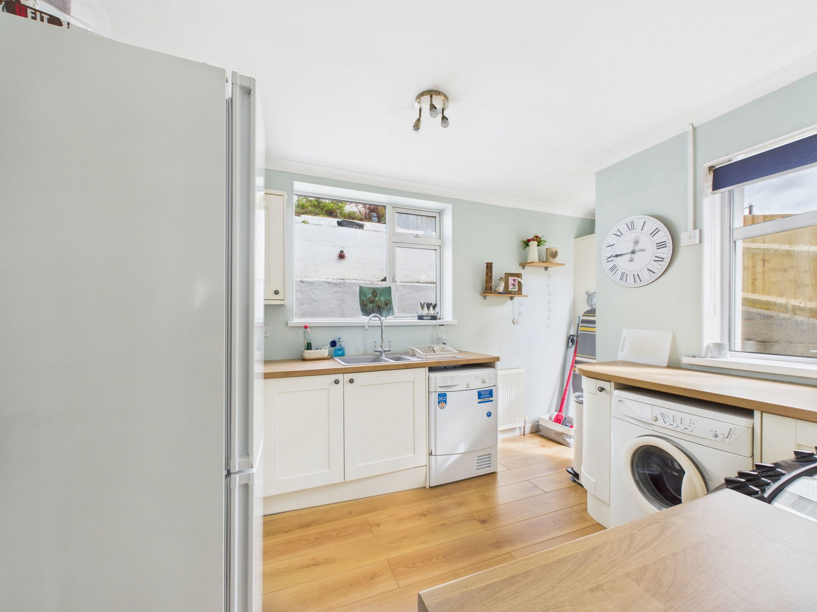 KITCHEN The modern kitchen is fitted with an excellent range of wall, base and drawer units complemented by roll edged work surfaces. Complete with a gas cooker, four ring hob and extractor hood above, it also offers space and plumbing for a washing machine, dryer, and fridge freezer. Two UPVC double glazed windows and a rear access door.