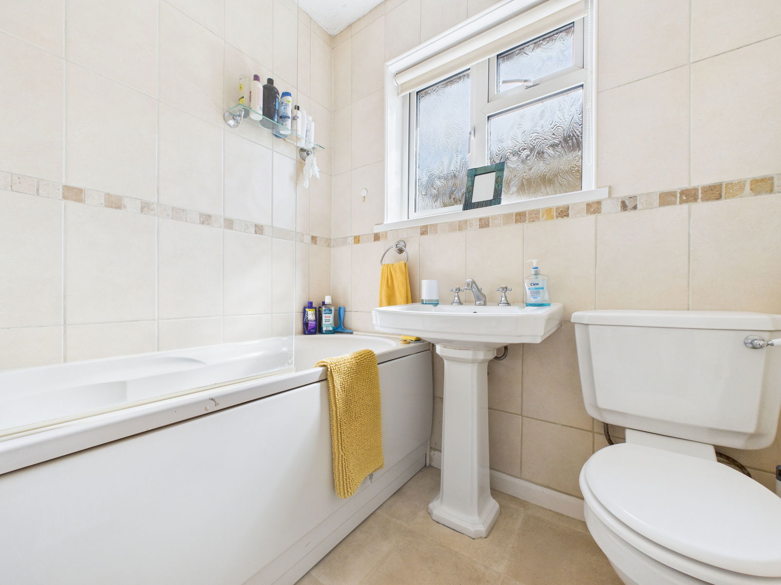 BATHROOM A well appointed three piece suite featuring a low level flush WC, pedestal wash hand basin and a panelled bath with shower attachment and glass screen. Finished with tiled walls, an airing cupboard housing the hot water cylinder, a UPVC obscured double glazed window and a gas central heated radiator.