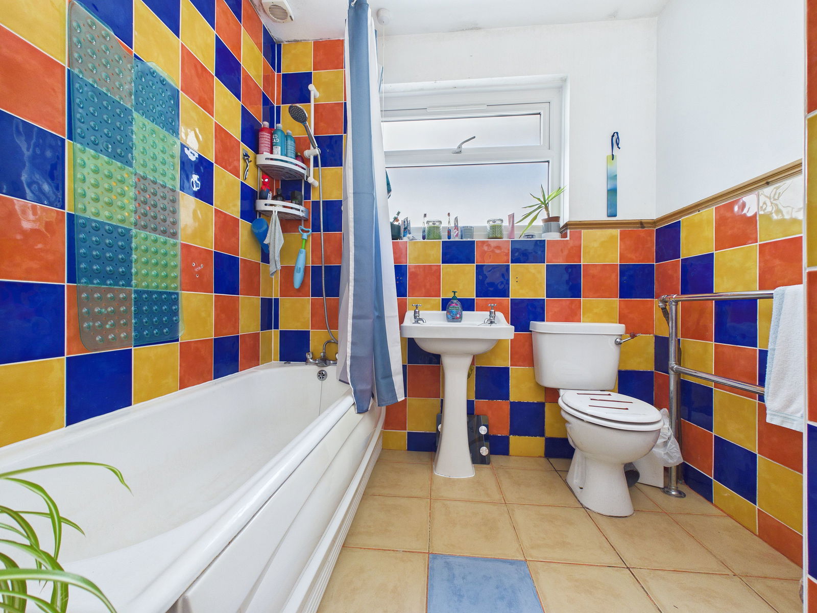 FAMILY BATHROOM A three suite comprising a low level WC, pedestal wash hand basin and panelled bath with shower over. Complemented by tiled walls, a uPVC double glazed window and a chrome heated towel rail.