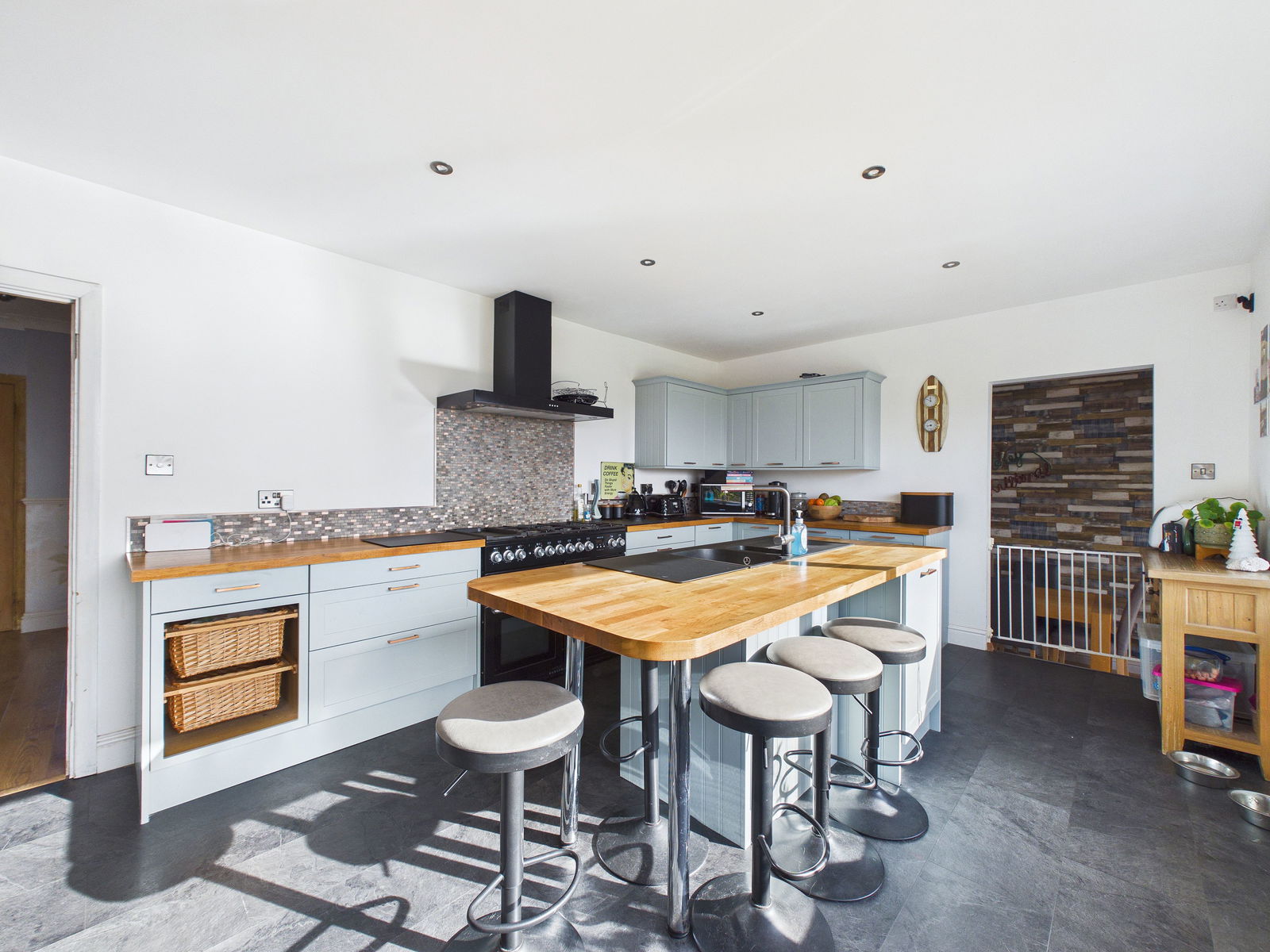 At the heart of the room, a substantial central island provides additional storage and breakfast bar seating for four, complemented by a deep fitted pantry cupboard. UPVC double glazed window overlooking the beautifully maintained rear gardens.