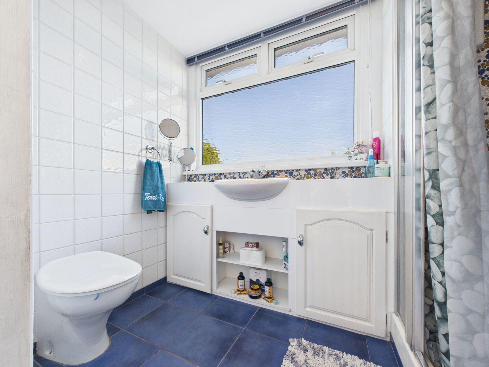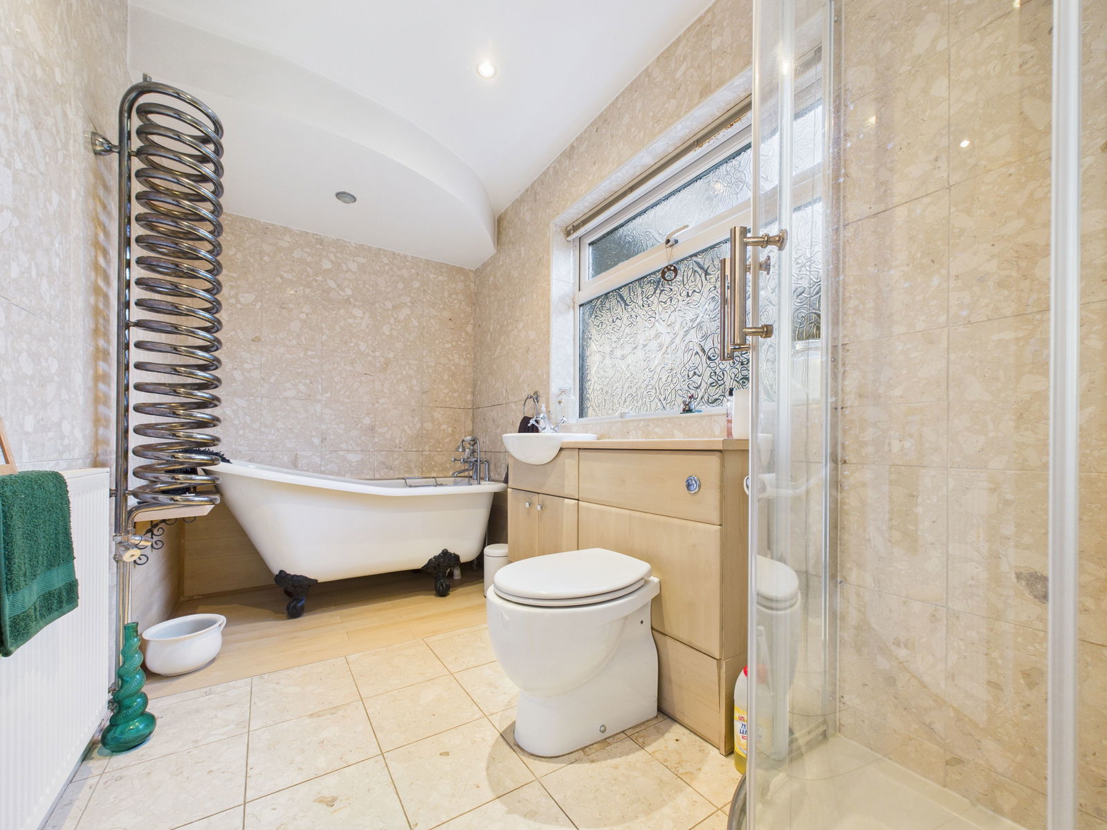 BATHROOM/WC Freestanding bath, WC, wash basin set into vanity unit, corner shower with electric unit, heated towel rail, radiator and obscure window.