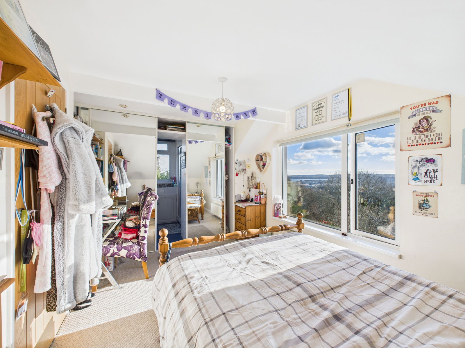 BEDROOM TWO Rear-facing with woodland and sea glimpses, radiator, power points, mirrored fitted wardrobes and door to:-