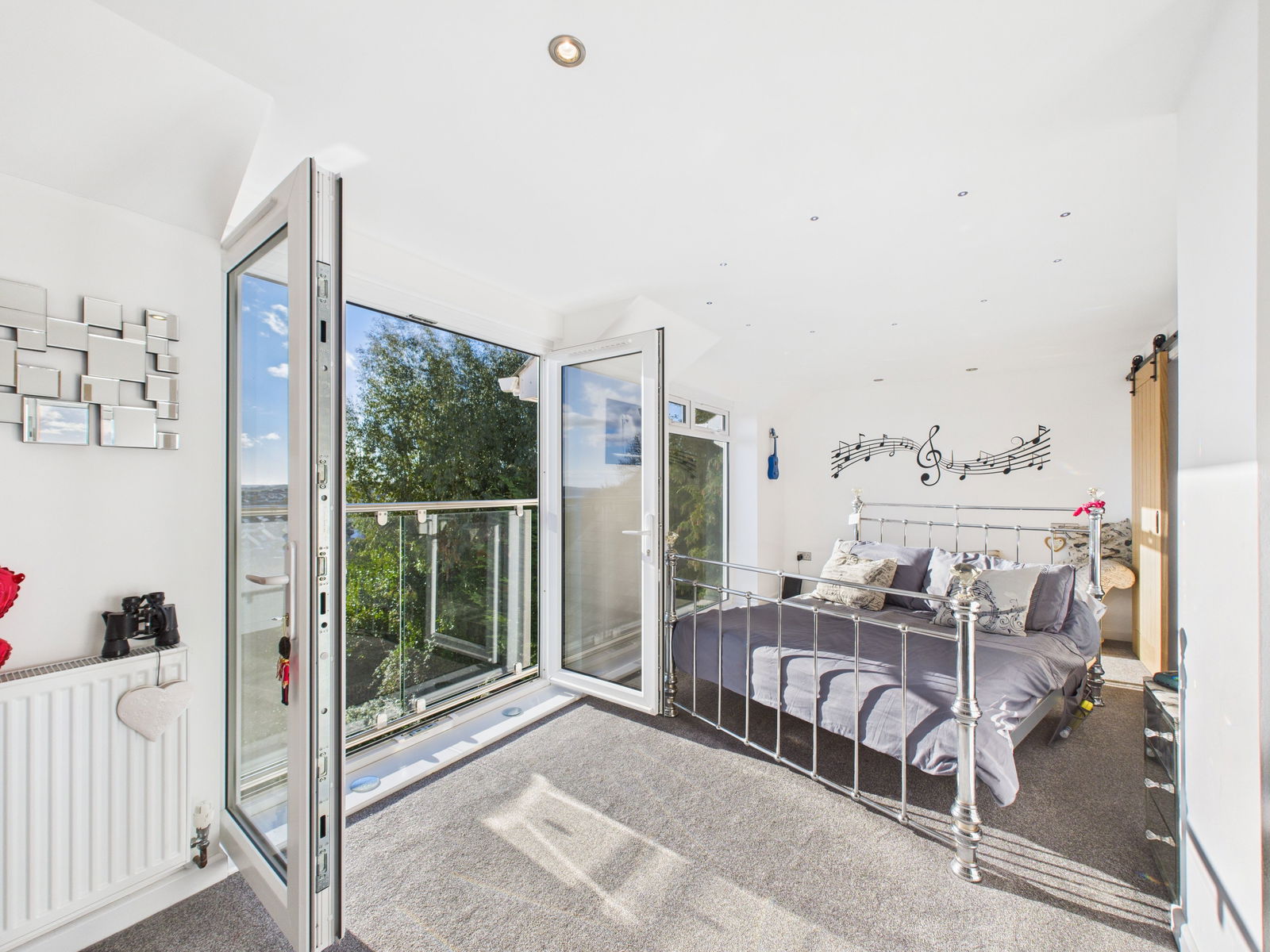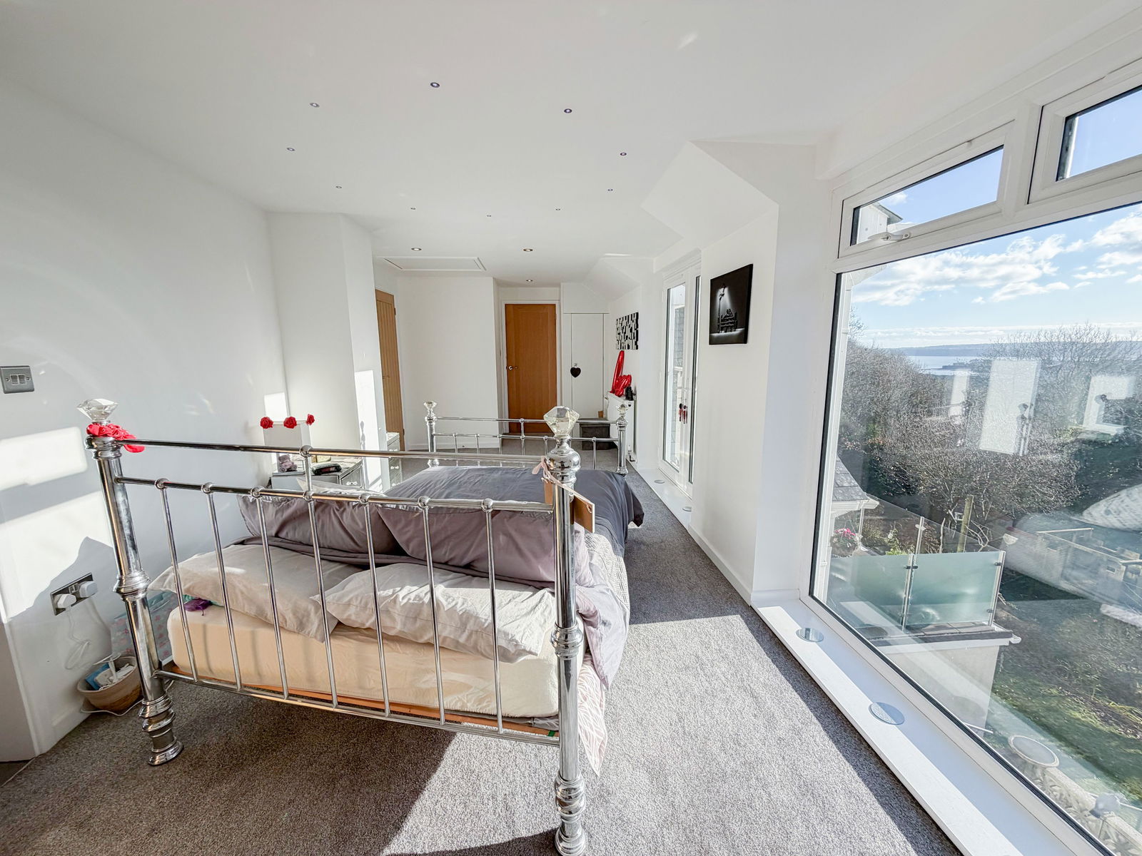 BEDROOM ONE Large picture window and patio doors opening onto a Juliet balcony, enjoying views over Occombe Woods, the garden and distant sea. Radiator, power points, loft access. Doors to:-
