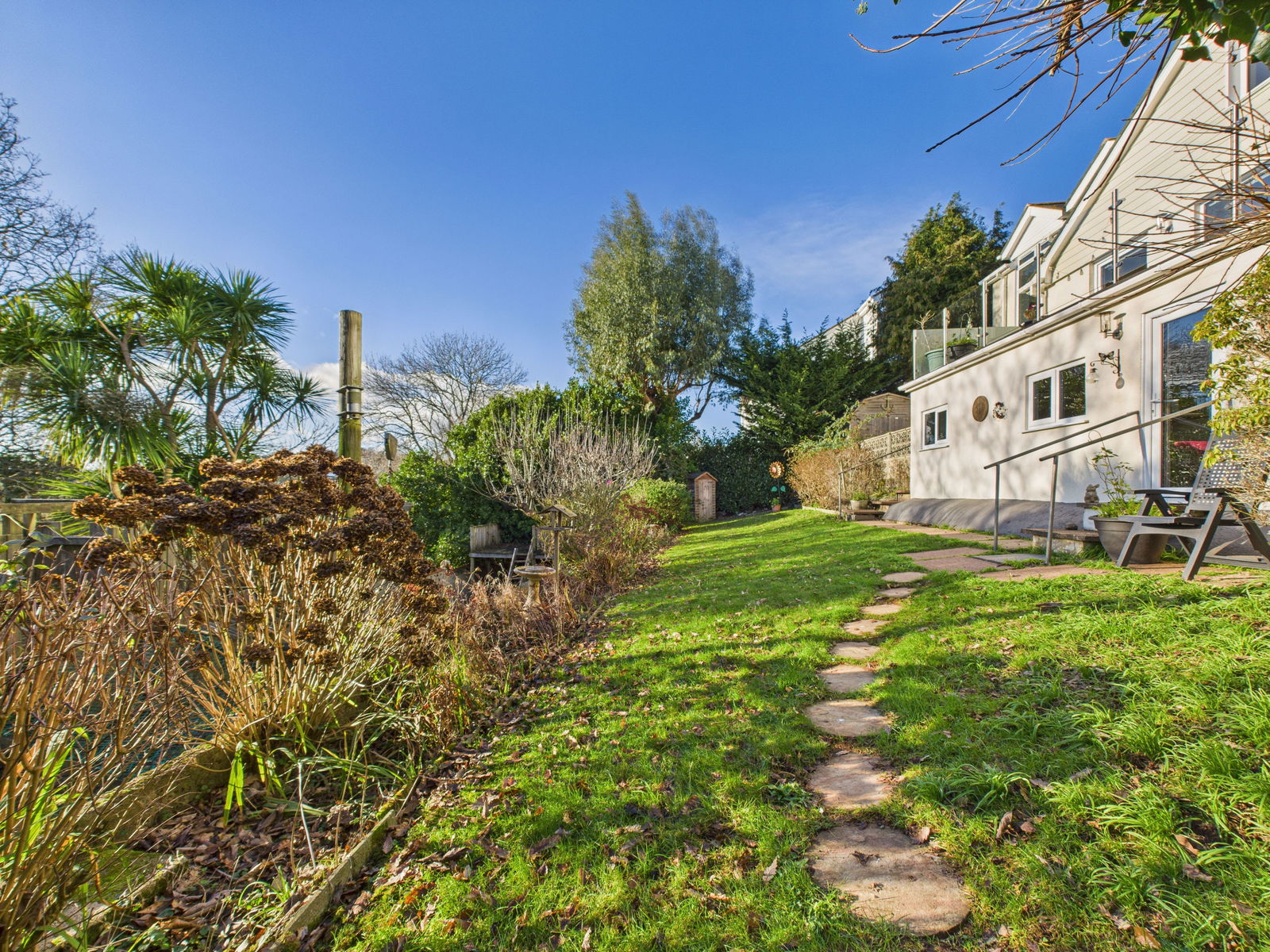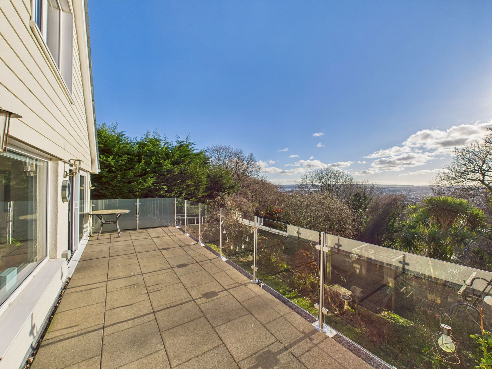 BALCONY Generous balcony with stainless steel and glass balustrading, enjoying a private outlook over the garden, Occombe Woods and distant sea views.