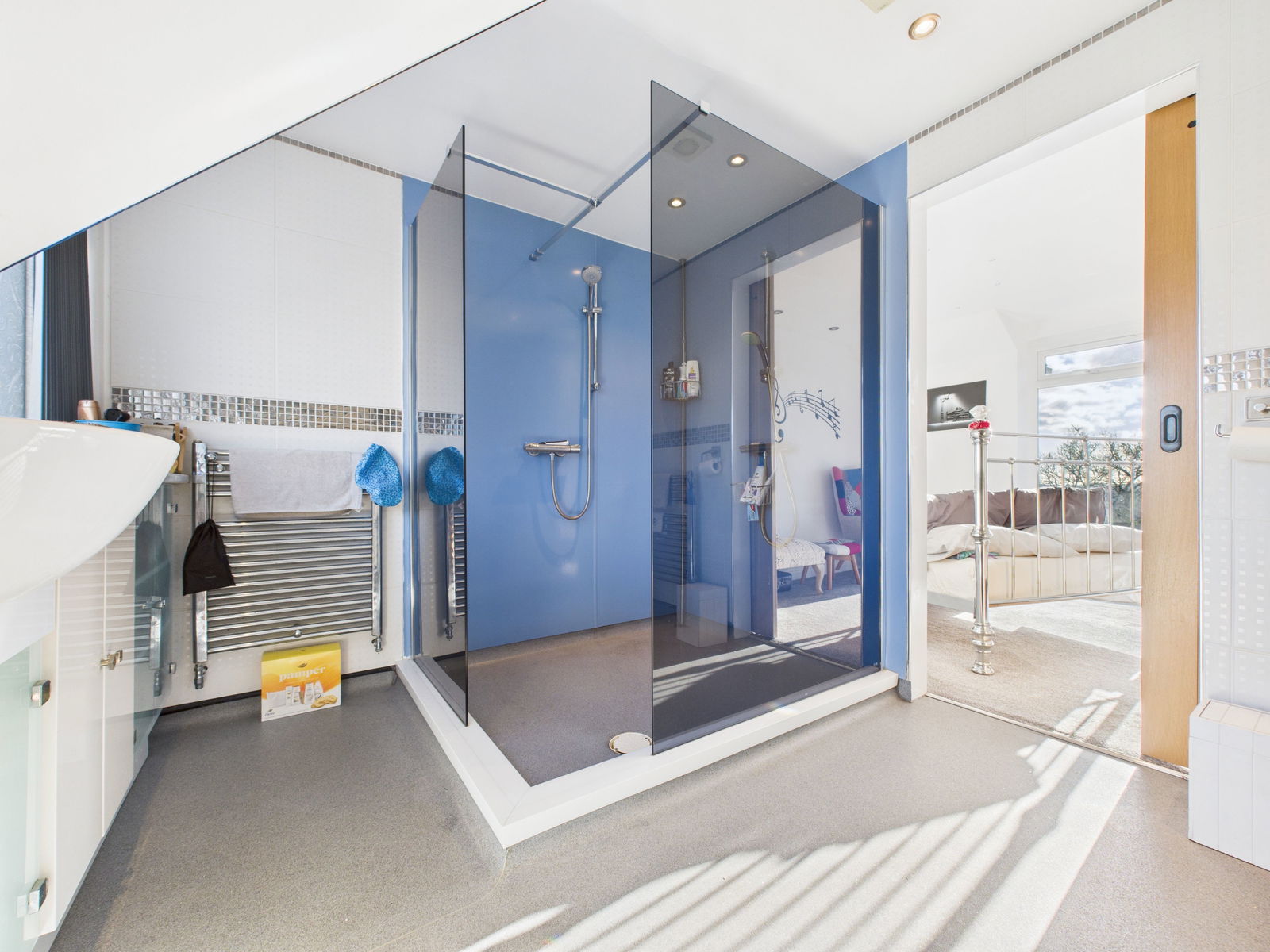 ENSUITE SHOWER ROOM/WC Double walk-in shower, wash basin set into vanity unit, bidet, WC, two chrome towel radiators and obscure window.
