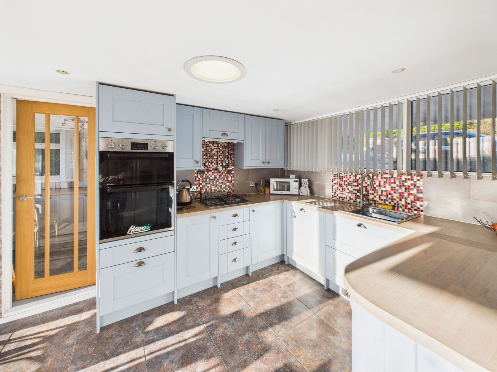 KITCHEN Fitted wall and base units with work surfaces, integrated double oven and dishwasher, four-ring gas hob, space for American-style fridge/freezer, stainless steel sink, power points. Windows to front and rear with sliding door to garden. Door to:-