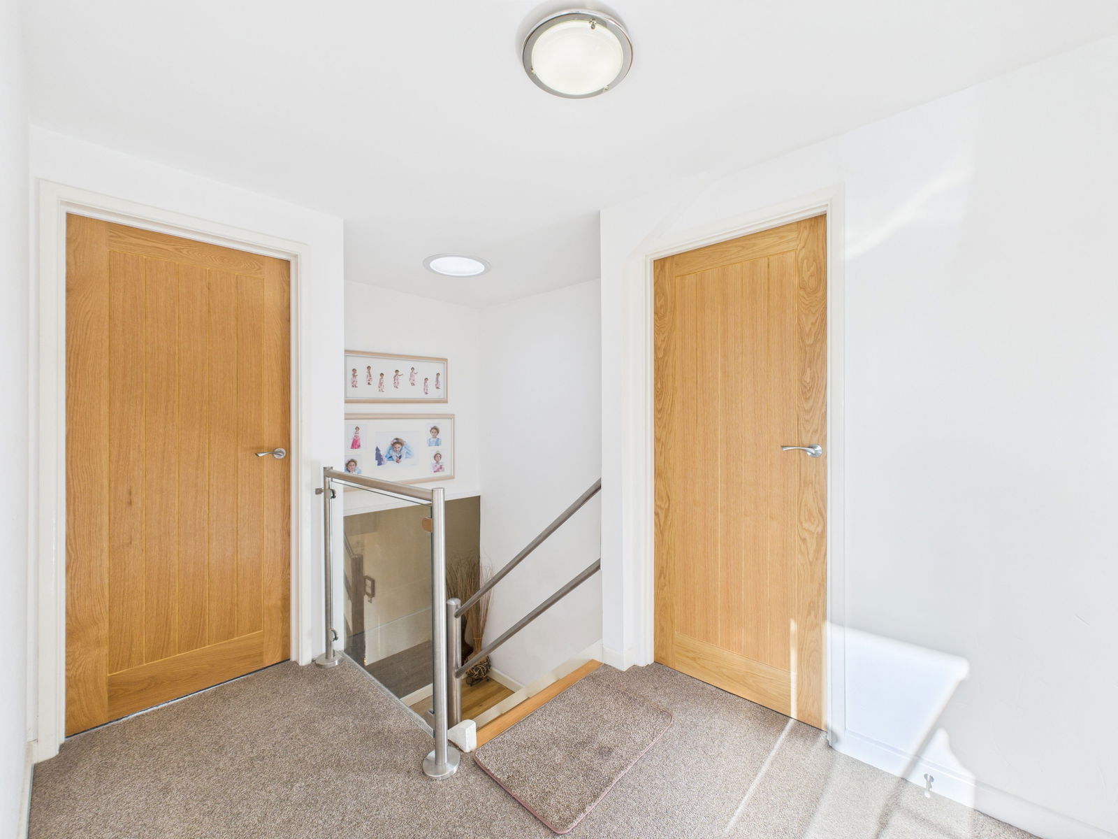 LANDING Sun tunnel, power points, glass balustrading and airing cupboard housing immersion tank.