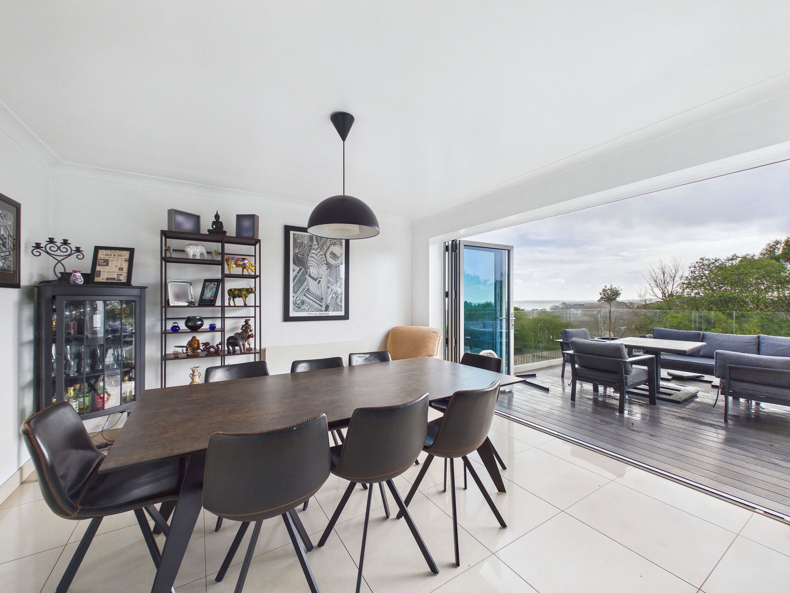 DINING ROOM A wonderfully spacious dining area designed for modern living and entertaining, comfortably accommodating an 8/10 seater table. An archway connects back to the kitchen, while glazed sliding doors open into the living room, enhancing the sense of space and flow. Aluminium double glazed bi-fold doors open directly onto the sun deck, where breathtaking sea views stretch across Paignton and towards Berry Head.