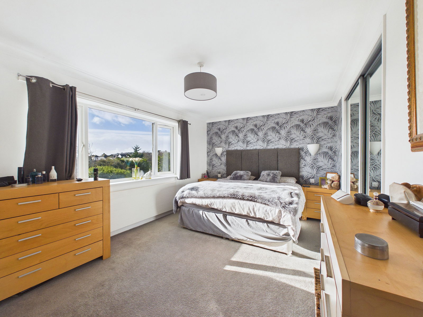 BEDROOM ONE An exceptionally spacious and sun drenched master bedroom boasting picturesque sea views across the bay and overlooking the beautifully maintained rear gardens. The room benefits from mirrored built in wardrobes, a uPVC double glazed window, gas central heating radiator and an ash door leading to:-
