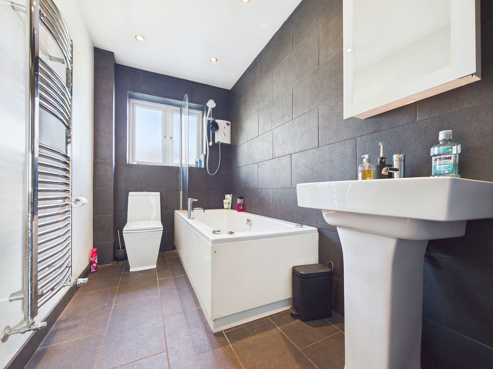 FAMILY BATHROOM A modern family bathroom comprising a low level WC, pedestal wash hand basin, and a panelled Jacuzzi bath with shower attachment over. Finished with tiled walls and flooring, an obscure uPVC double glazed window and a chrome heated towel rail.