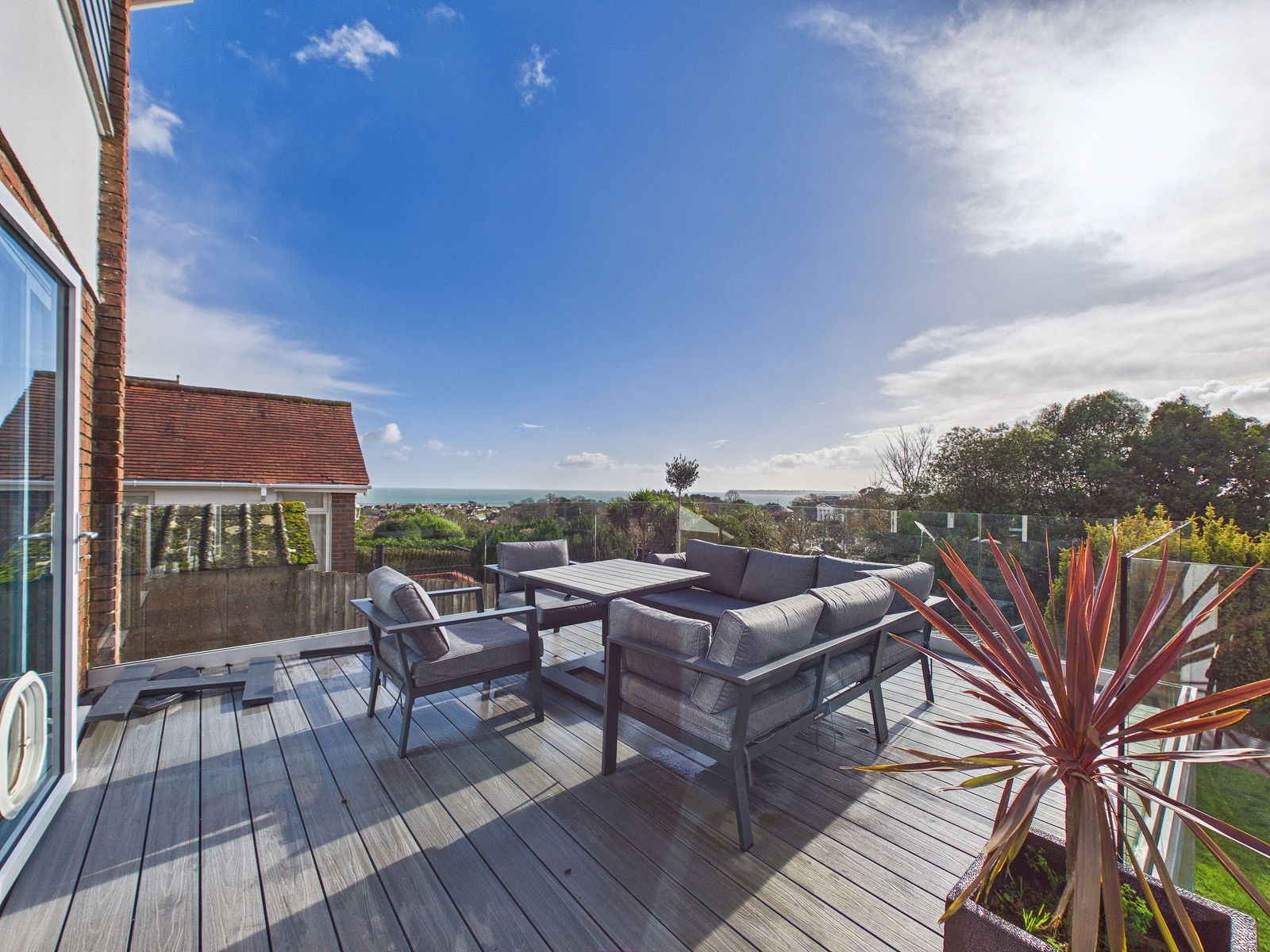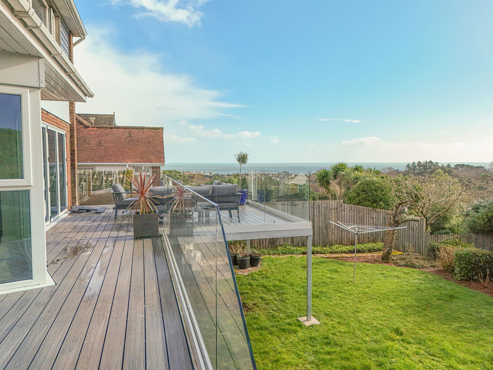 REAR GARDEN The south facing rear garden has been thoughtfully designed to maximise both sunshine and enjoyment. A large composite sun deck extends from the living areas, complete with integrated outdoor lighting perfect for alfresco dining and entertaining whilst enjoying the gorgeous sea views. Steps descend to a further patio area and onto expansive lawned gardens bordered by mature shrubs and planting.