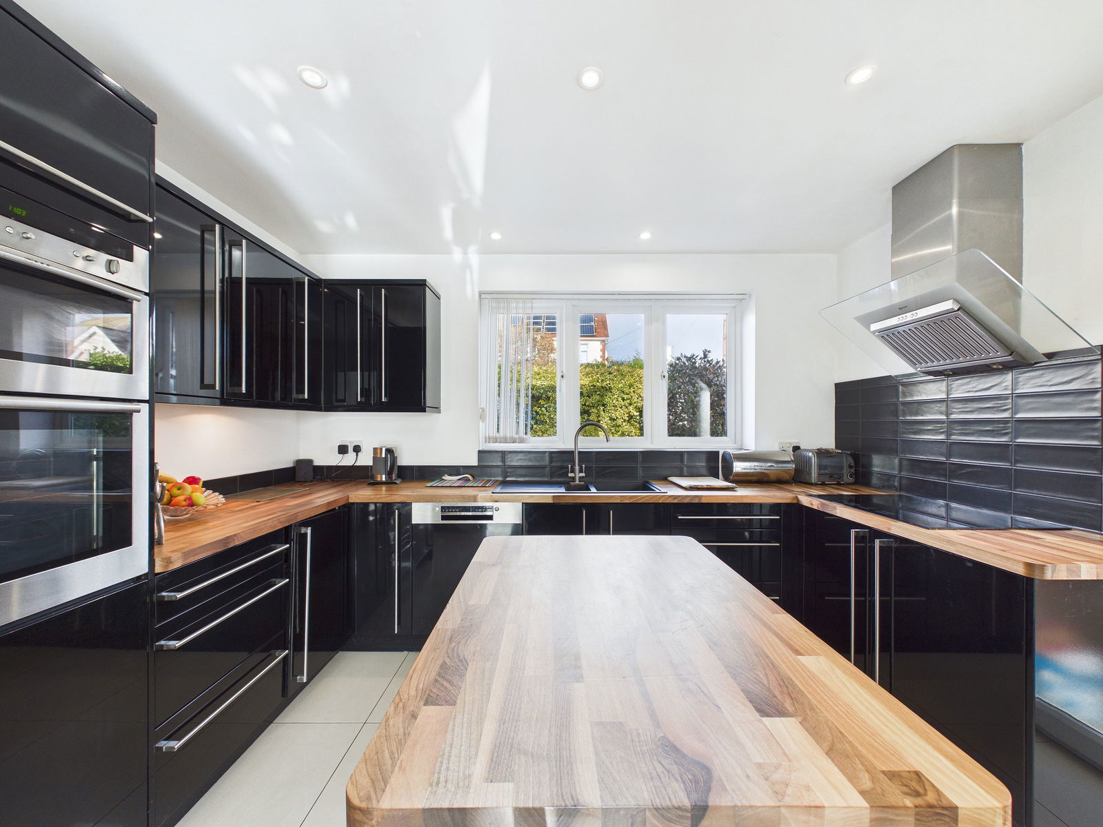 KITCHEN This spacious and contemporary kitchen is beautifully appointed with an extensive range of base, wall and drawer units complemented by solid wood work surfaces. A 1.5 bowl composite sink and drainer, quality appliances including an eye level double Neff oven with grill, five ring induction hob with extractor hood above, integrated microwave, and a built in coffee machine. A Bosch integrated dishwasher is also included. There is space and plumbing for a fridge freezer, underfloor heating, a gas central heating radiator, and a uPVC double glazed door leading to an additional porch area. An open archway flows seamlessly into the dining room.