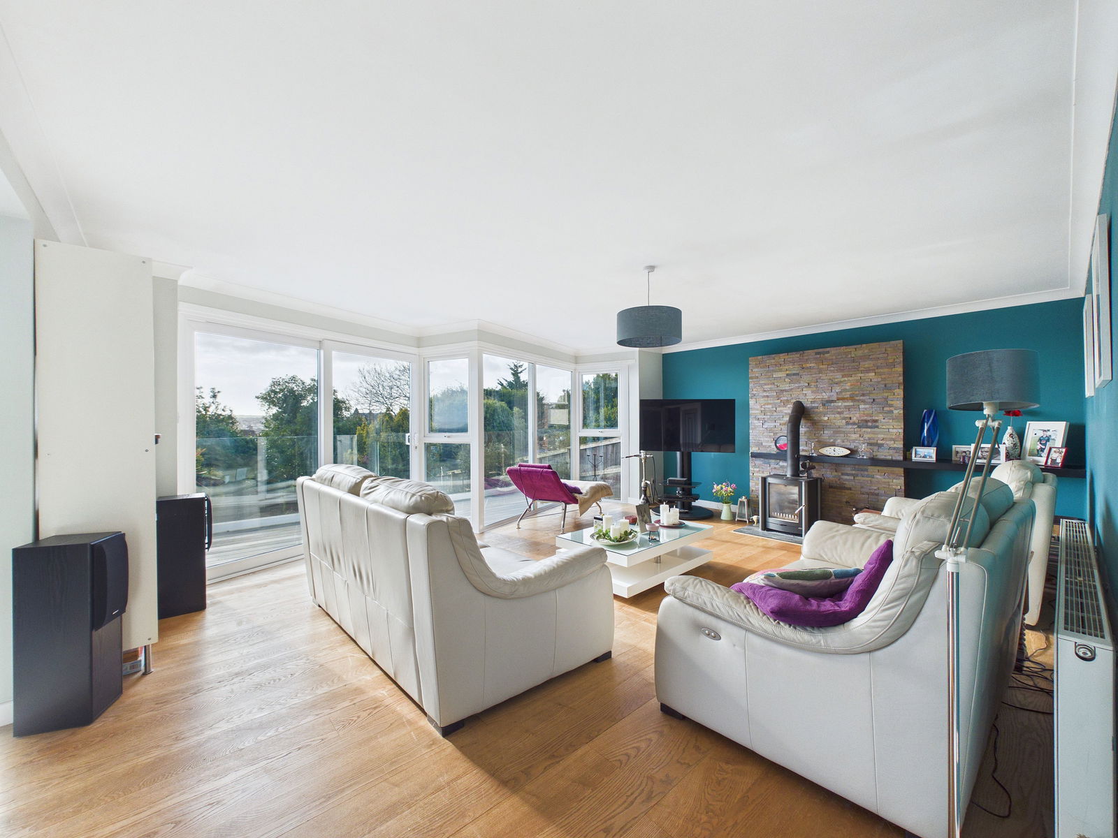 LIVING ROOM A beautifully light filled living room enjoying a desirable south facing aspect over the landscaped gardens with picturesque sea views towards Berry Head, Brixham. The room features a charming log burning stove, television and internet points, ample space for furnishings, and subtly tinted uPVC double glazed windows that still allow light to flood in. Sliding patio doors open onto the decked terrace, and a gas central heating radiator. Solid Ash flooring throughout.