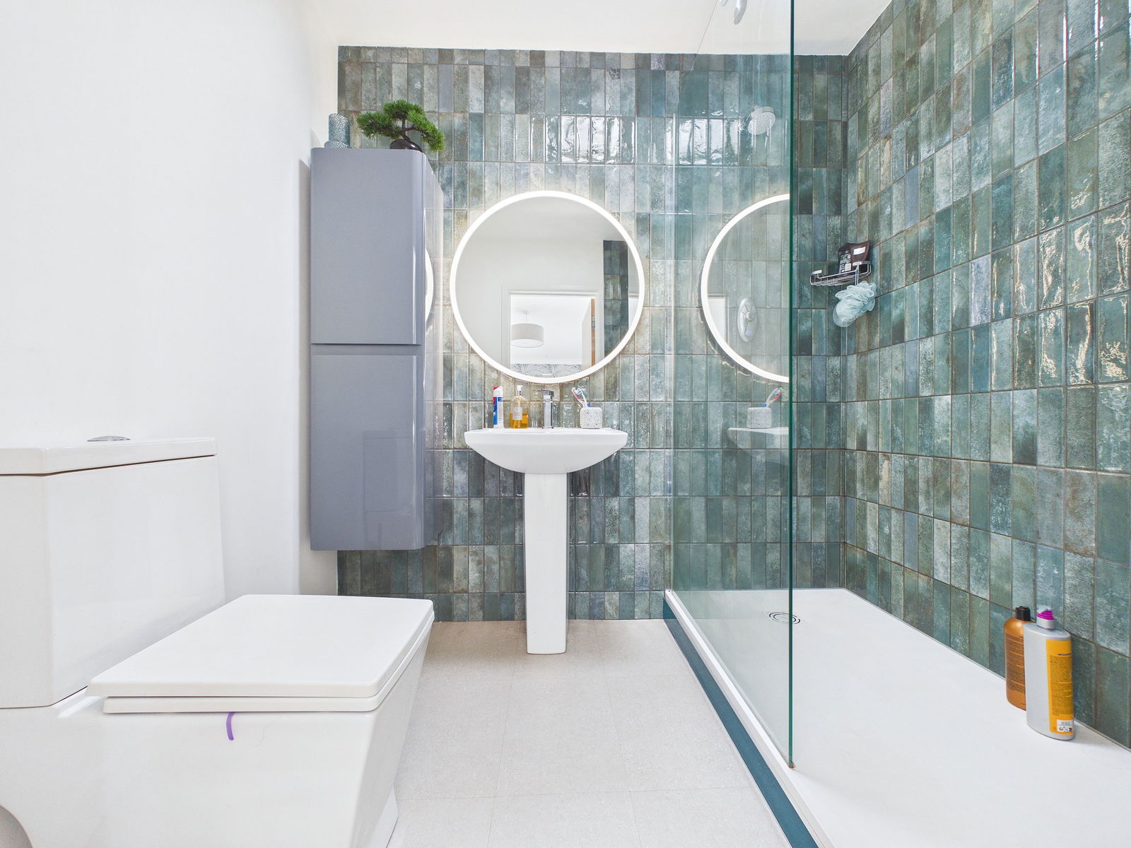 EN-SUITE A sleek and contemporary en-suite featuring a low level WC, pedestal wash hand basin, and a generous walk in shower enclosure with power shower. Finished with modern tiling, a wall hung cabinet and a matt grey heated towel rail.