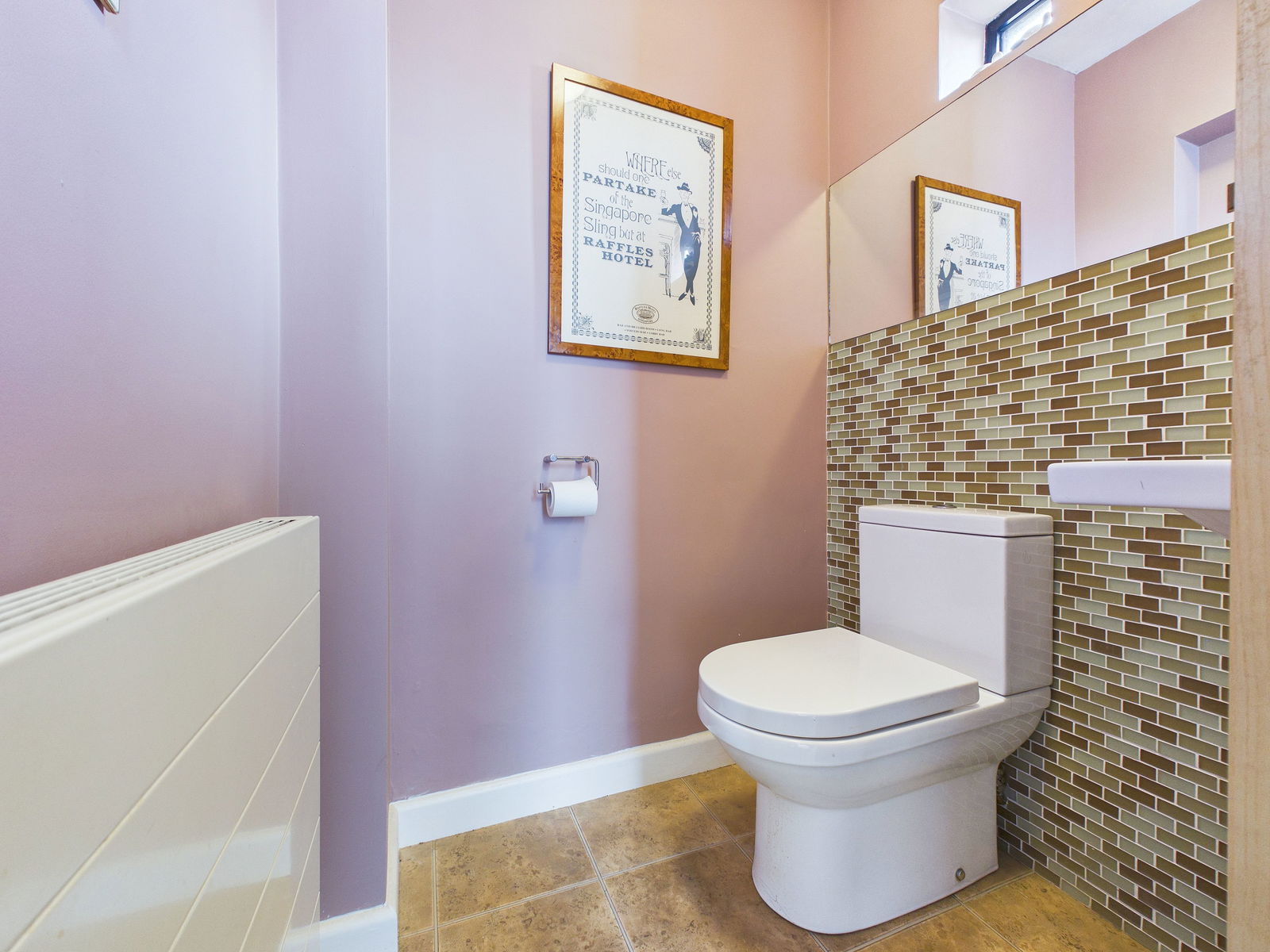 CLOAKROOM A practical ground floor cloakroom comprising a low level WC, pedestal wash hand basin, part tiled walls, obscure glazed windows and a gas central heating radiator.