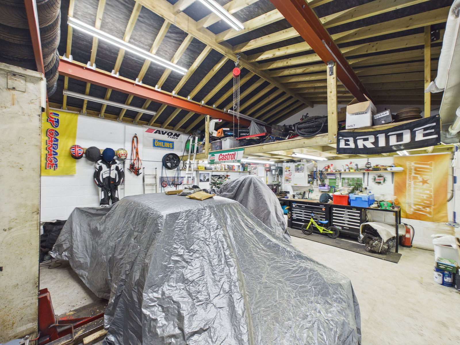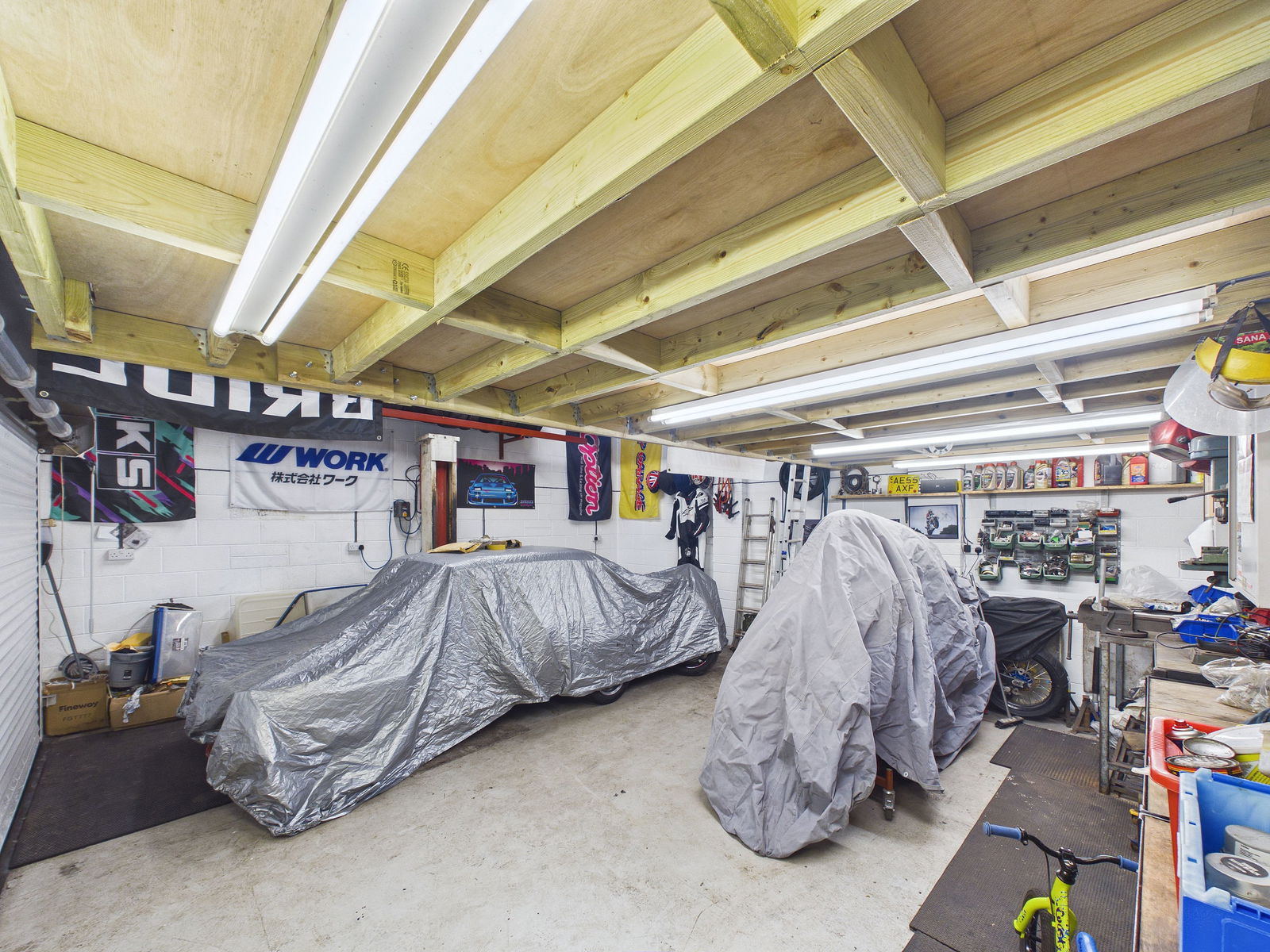 GARAGE An exceptionally large double garage, designed with car enthusiasts in mind. Features include an electric roller door, courtesy door, lighting and power points, a vehicle lift, and a block and tackle chain system. A substantial mezzanine level accessed by ladder provides excellent additional storage space.