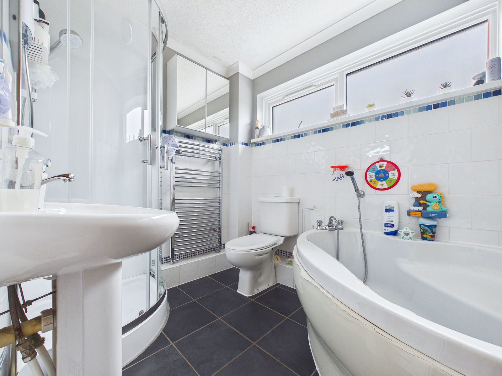 BATHROOM A spacious family bathroom fitted with a low level WC, pedestal wash hand basin, corner bath, and separate corner shower enclosure. Complemented by tiled walls, a uPVC obscure double glazed window, a mirrored medicine cabinet and a chrome heated towel rail.