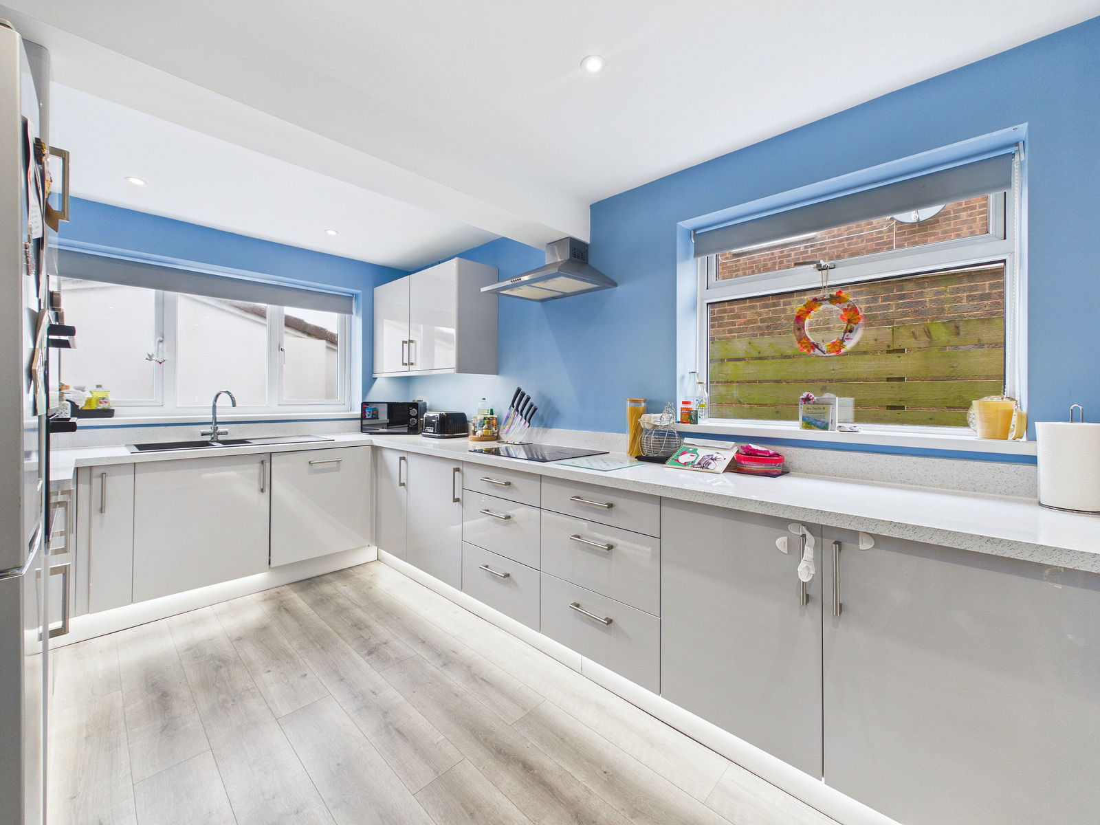 KITCHEN A stylish and modern kitchen featuring an extensive range of wall, base, and drawer units with square edge work surfaces over. Appliances include a 1.5 bowl composite sink with drainer, an eye level electric double oven with grill, and a four ring electric hob with extractor hood above, as well as an integrated dishwasher. There is space and plumbing for a washing machine, tumble dryer and fridge freezer. Additional benefits include breakfast bar seating, a cupboard housing the Baxi boiler, and double aspect uPVC double glazed windows.