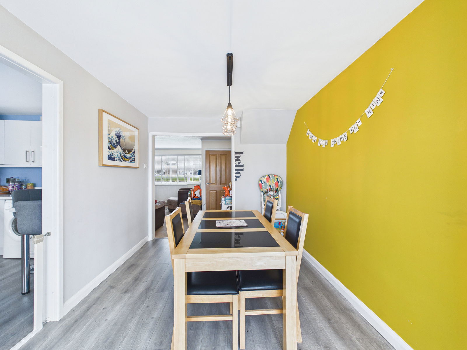 DINING AREA A generous, light filled dining area with ample space for a seating or play area. Double aspect uPVC double glazing includes windows and French doors opening onto the garden, along with a gas central heating radiator.