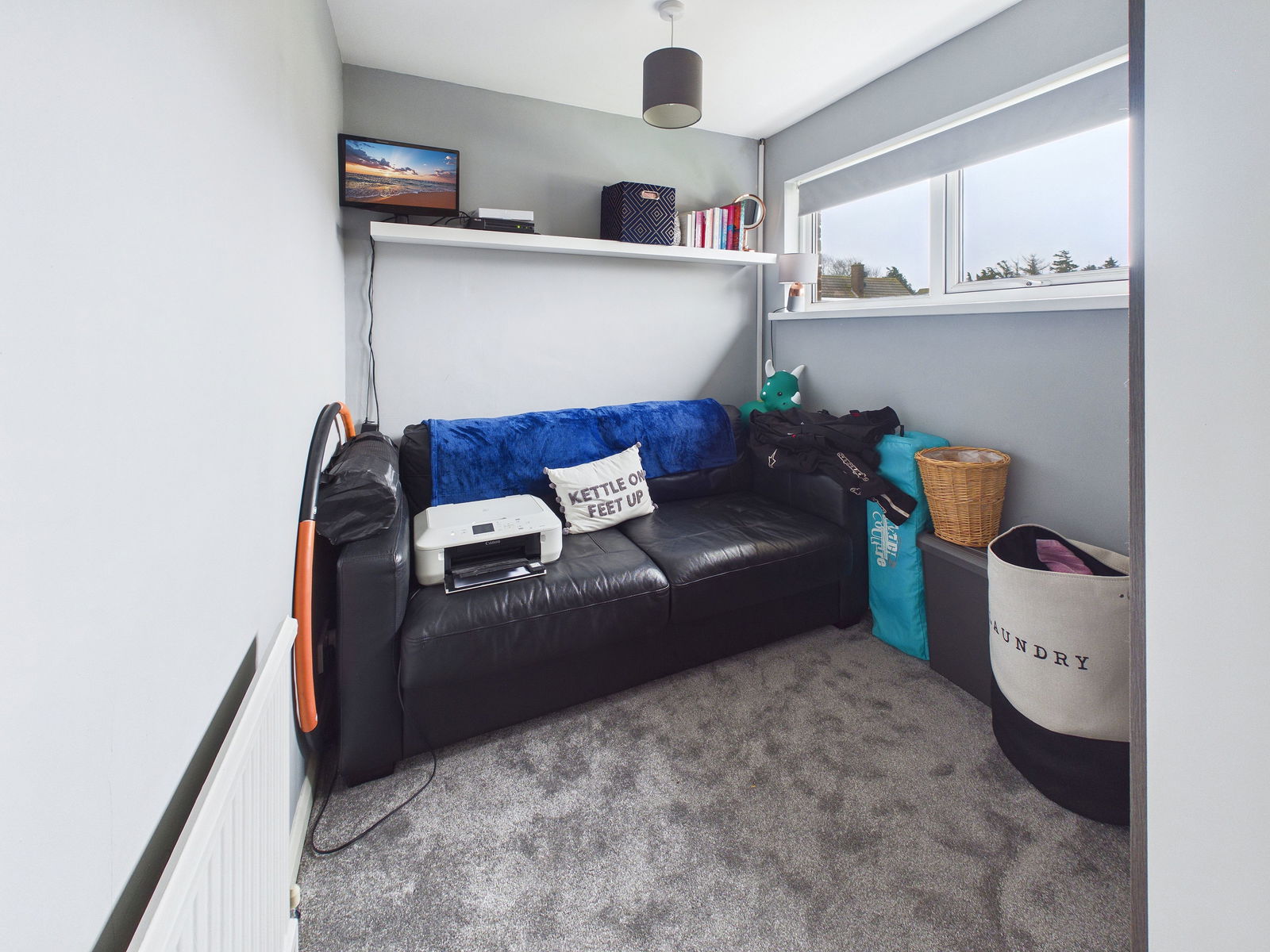 BEDROOM ONE A spacious principal bedroom positioned at the front of the property, offering generous proportions and a built in storage cupboard with shelving. Includes a uPVC double glazed window and gas central heating radiator.