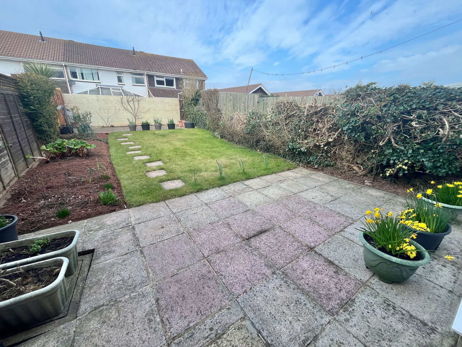 REAR GARDEN Patio and lawned garden area with further patio area.