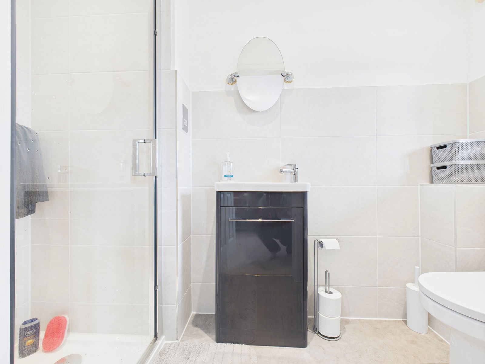ENSUITE Replaced luxury suite comprising shower cubicle. Vanity basin, low level WC and uPVC double glazing. Mostly tiled, chrome radiator and uPVC window.