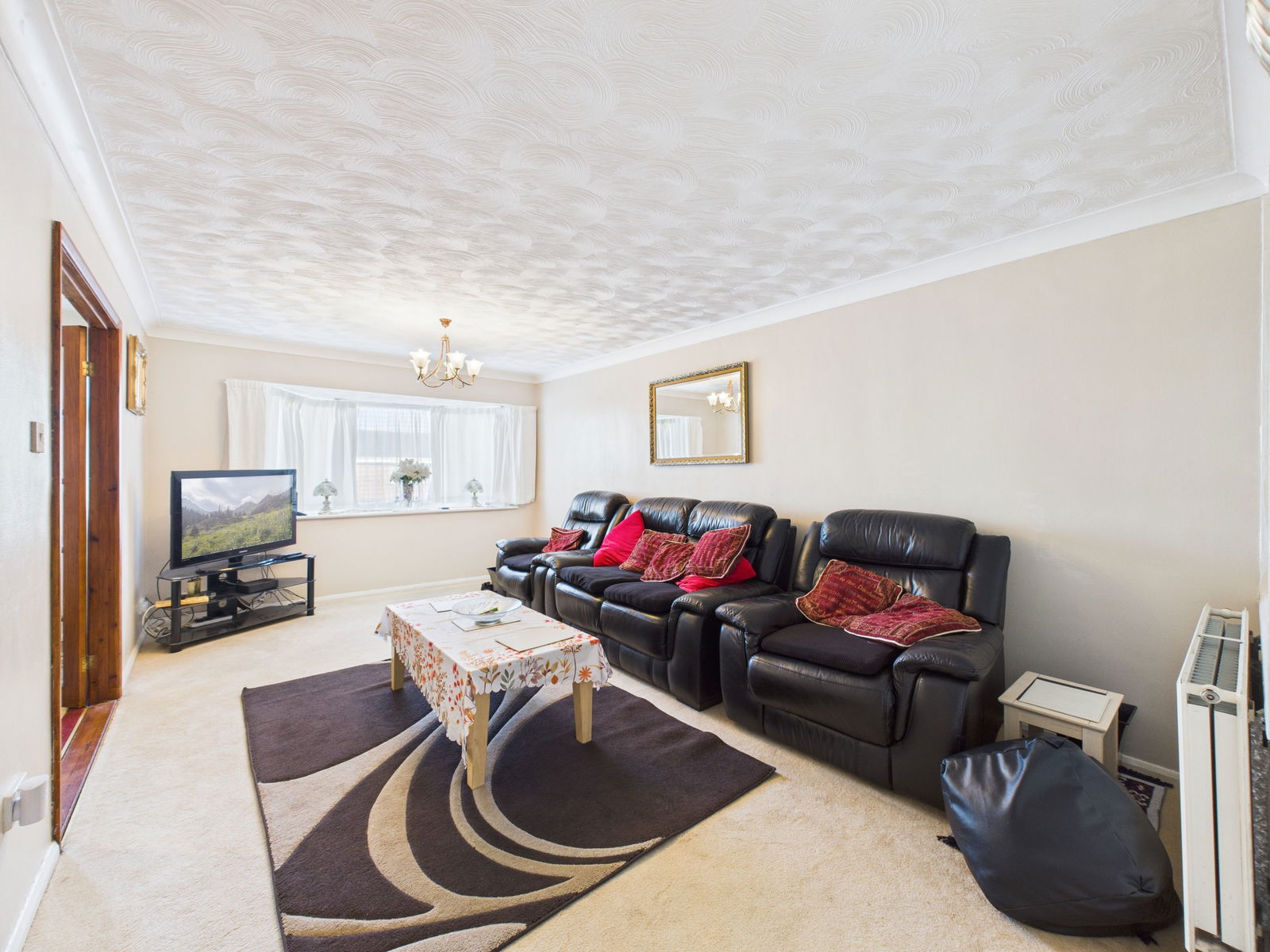 LOUNGE PVCu double glazed window to front enjoying some sea views, central heating radiator and power points, double opening doors to:-