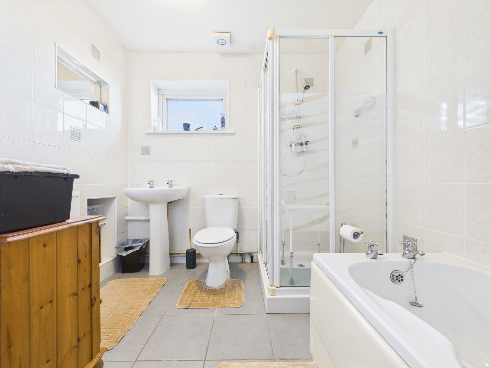 BATH/SHOWER ROOM & WC Shower enclosure with electric shower to wall, pedestal wash hand basin, W.C, central heating radiator, small panelled bath, fully tiled walls, obscure PVCu double glazed window to side, extractor fan.